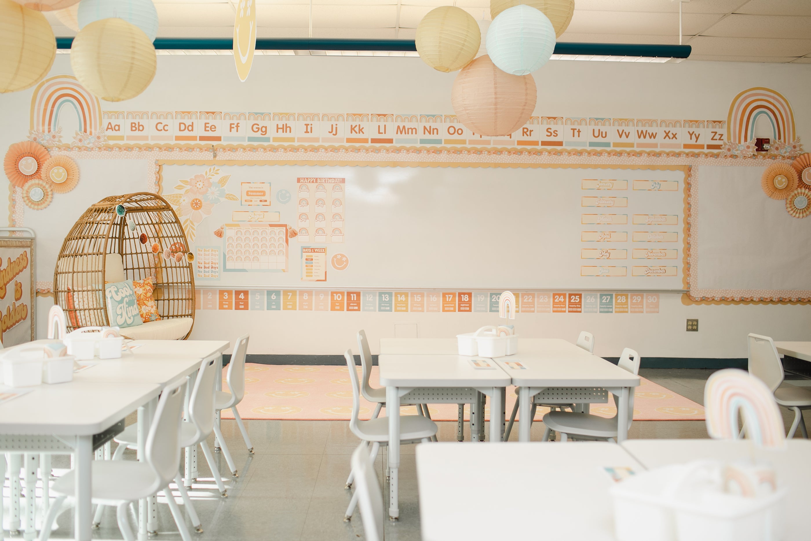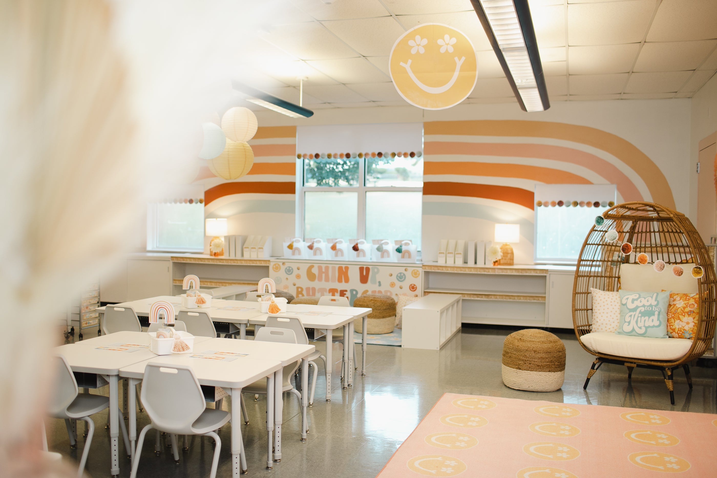 The Schoolgirl Style Good Vibes classroom makeover took place in Massachusetts for Megan, a passionate first-grade teacher! Our goal was to create a joyful, welcoming space where her students would feel safe, comfortable, and inspired. A standout feature of the room is the incredible mural painted by our talented graphic designers, which adds a vibrant and uplifting touch to the classroom! With bright colors, thoughtful details, and a positive atmosphere, we’re confident this space will be a place where both learning and creativity can truly flourish.