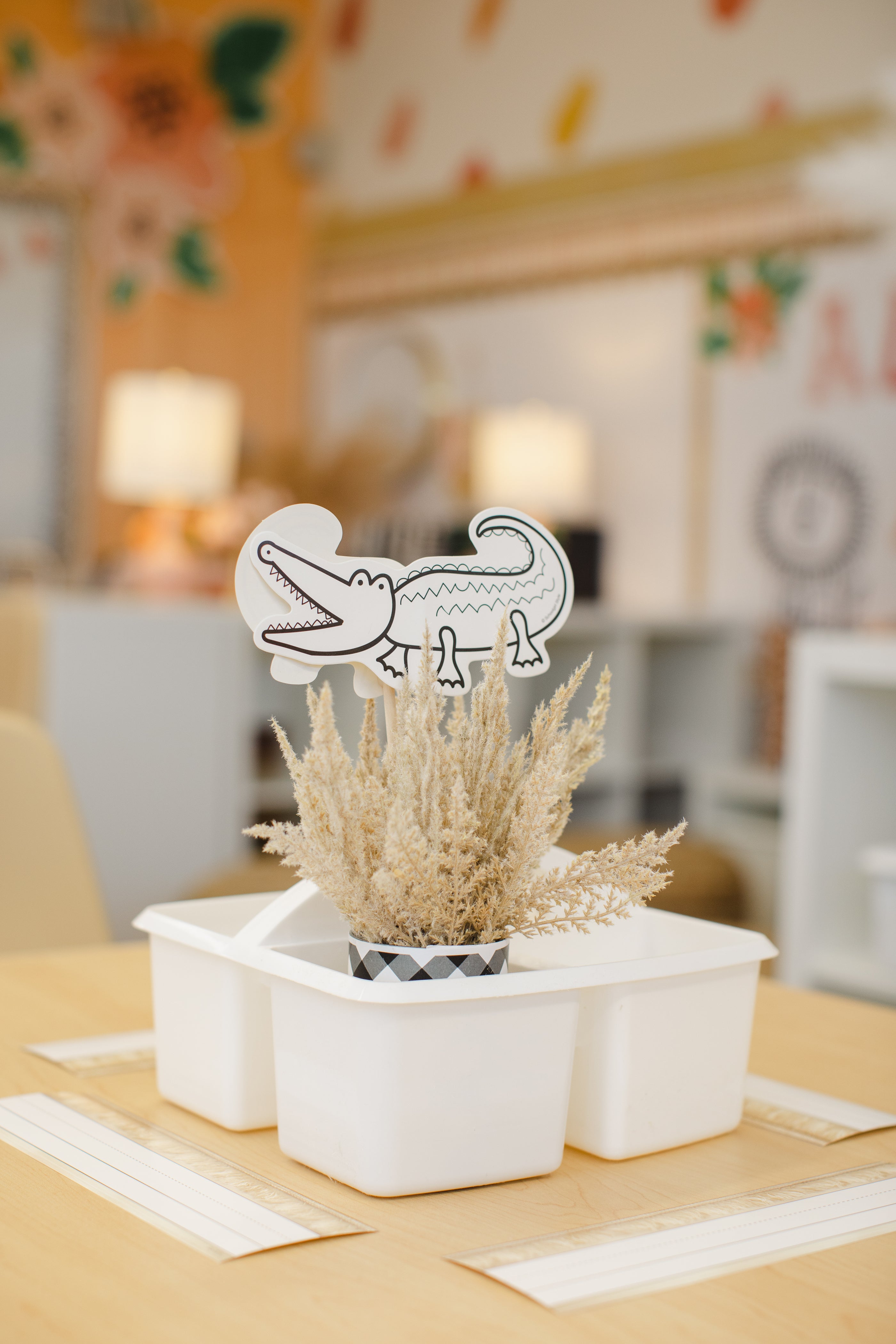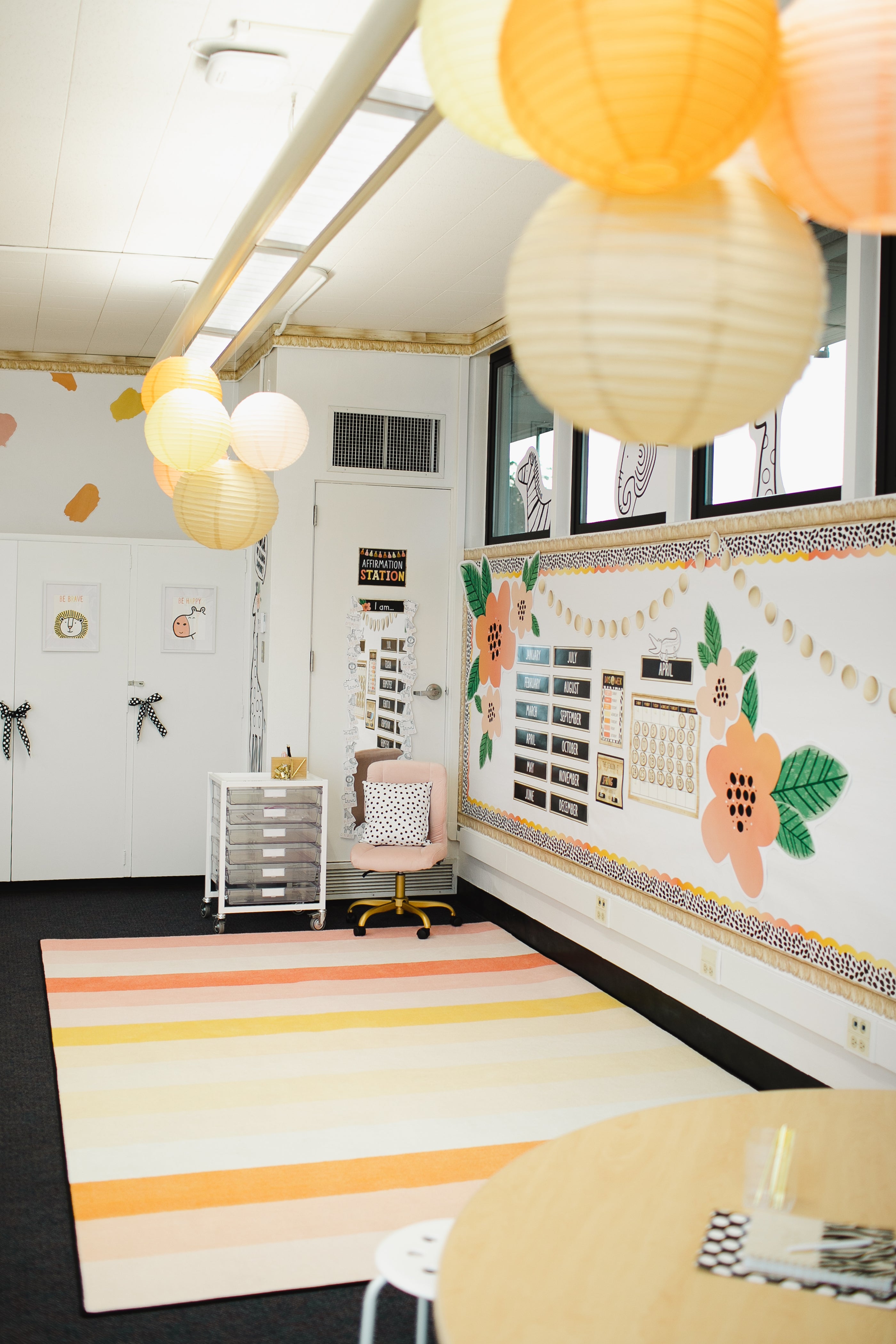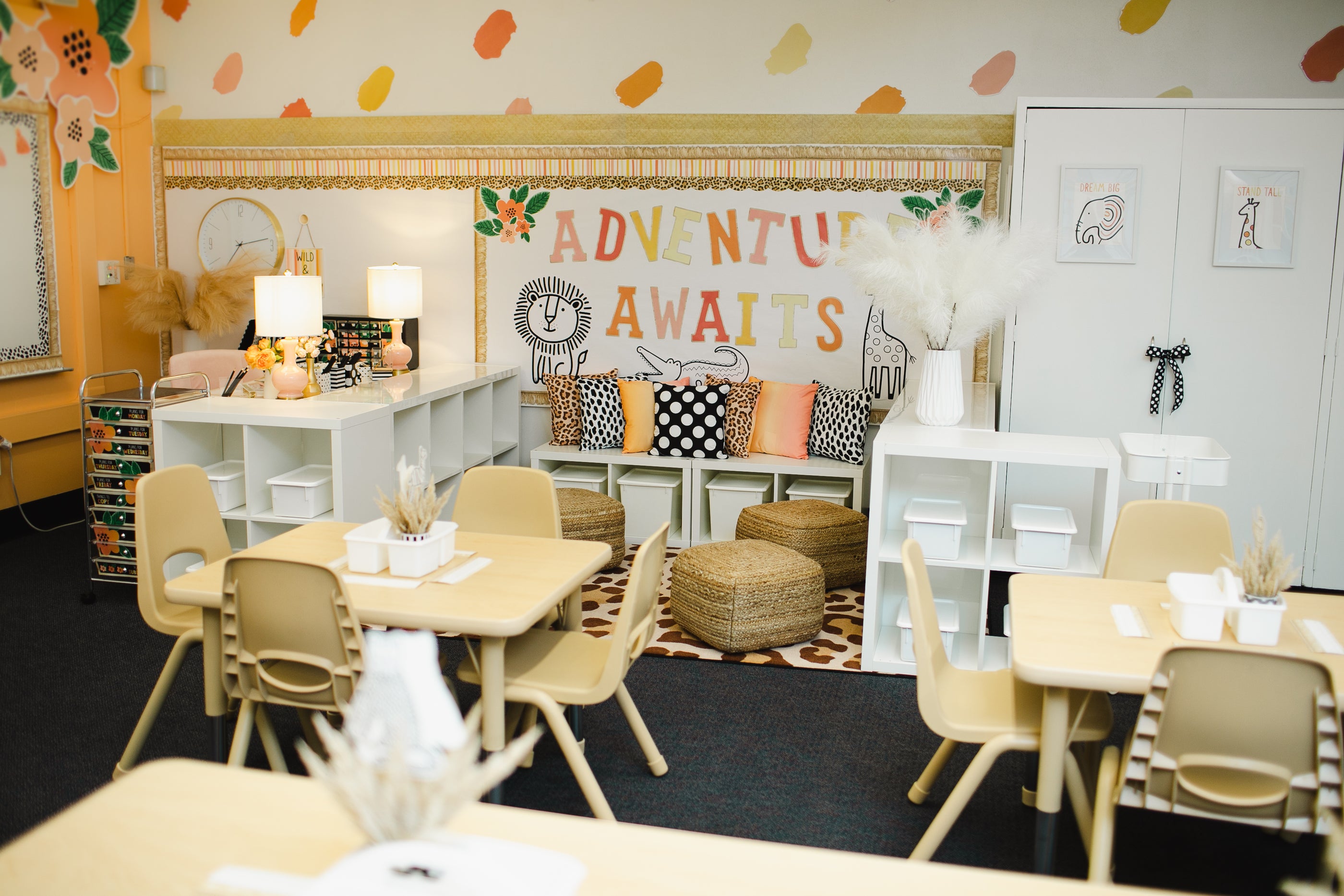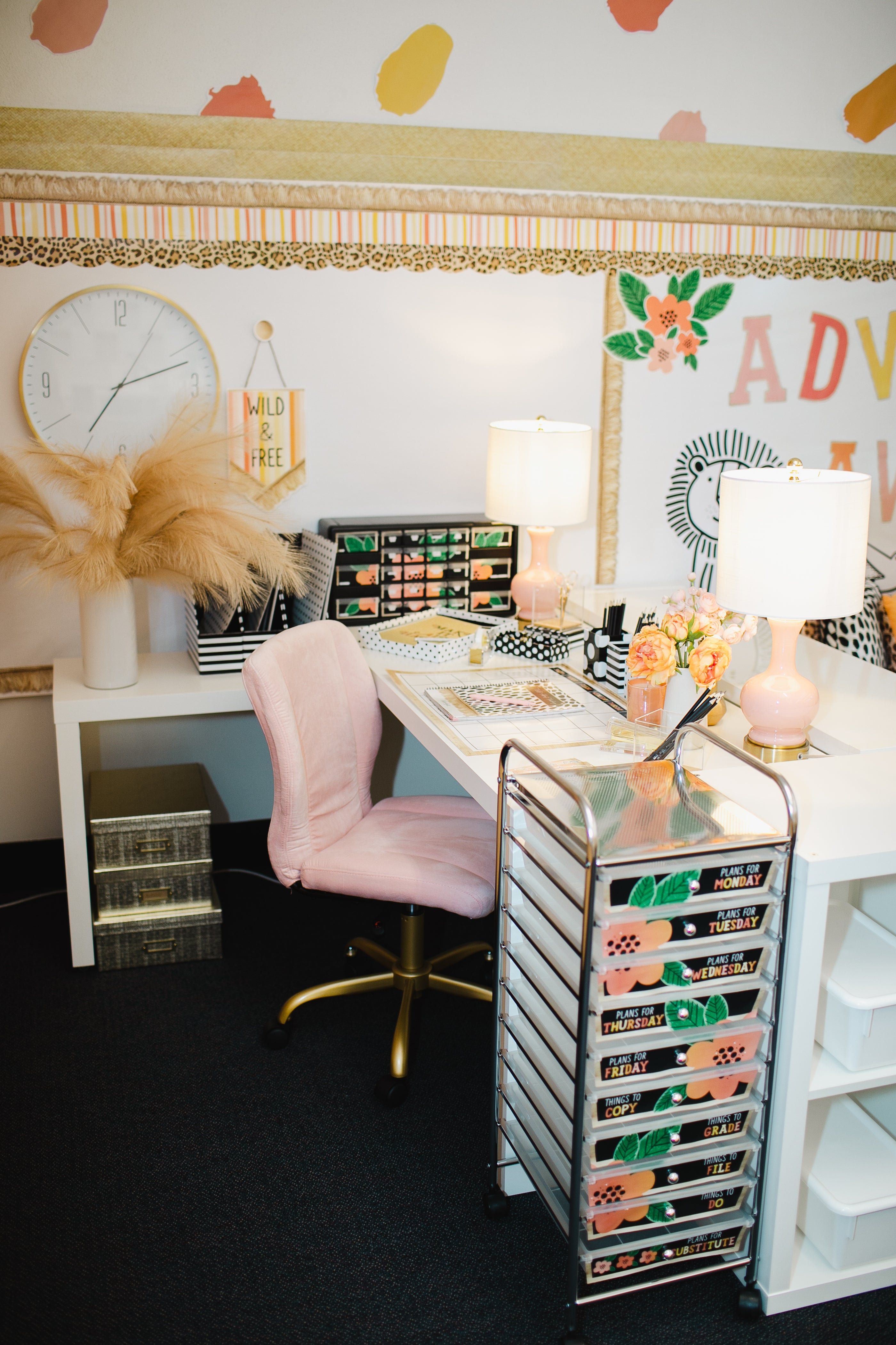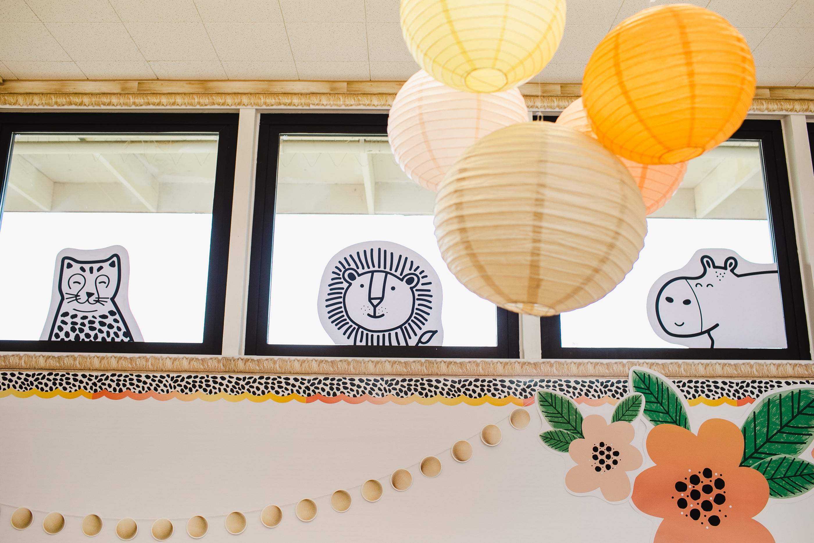 The Schoolgirl Style team transformed a first grade classroom in Santa Ana, California using the Simply Safari Collection. This collection is all about warmth woven throughout with the most beautiful sunset tones, and adorable safari animals are sprinkled about making it oh-so-charming! We focused on giving Karla lots of storage and organization to keep her room functional throughout the school year.