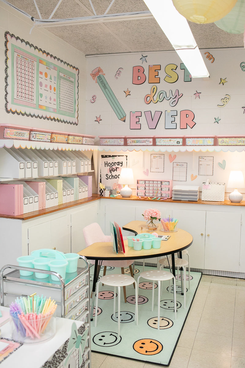 Start with warm, inviting elements like rugs, soft color palettes, and bulletin boards that feature student work. Layer in borders, door decor, and simple cutouts to add personality. Schoolgirl Style collections are designed to help teachers create a space that feels homey—not overwhelming.