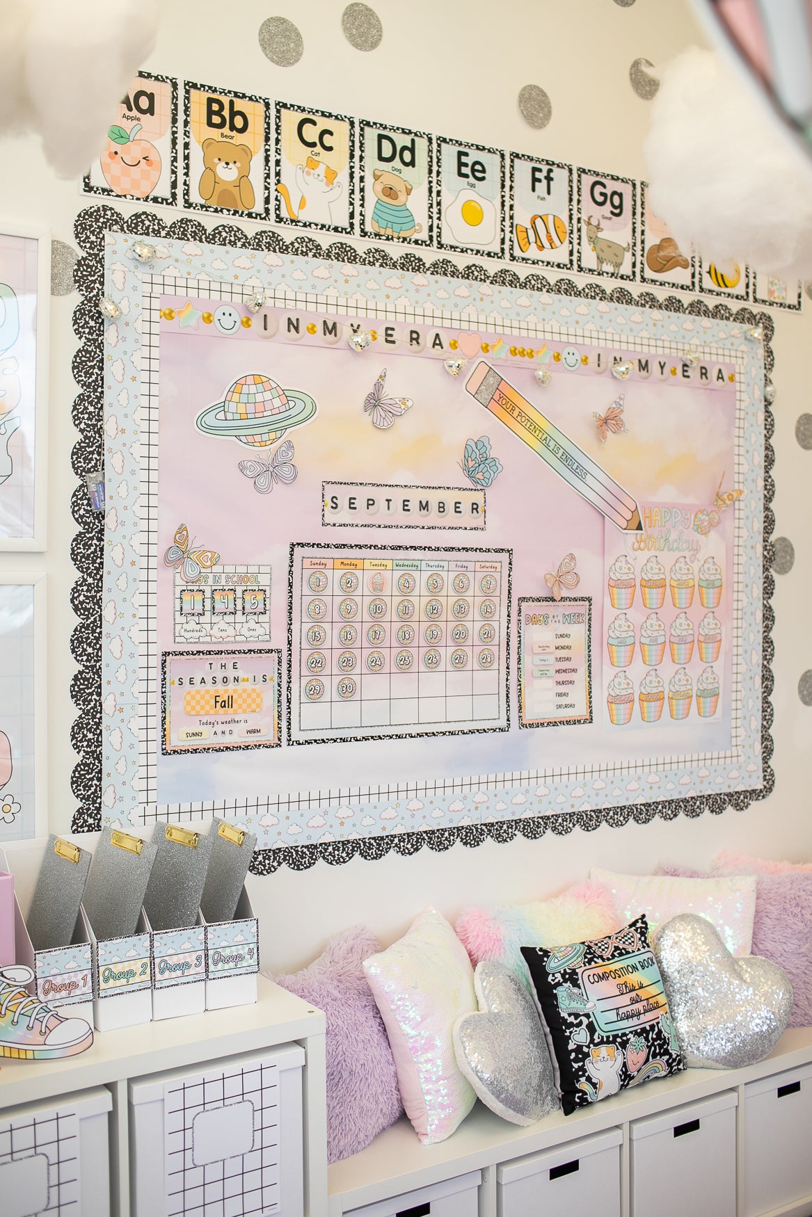 Soft rainbows and pastels help create a positive, soothing atmosphere that still feels inspiring. Many Schoolgirl Style collections use colors proven to boost mood and reduce visual stress, especially when paired with organized bulletin board displays and coordinated borders.