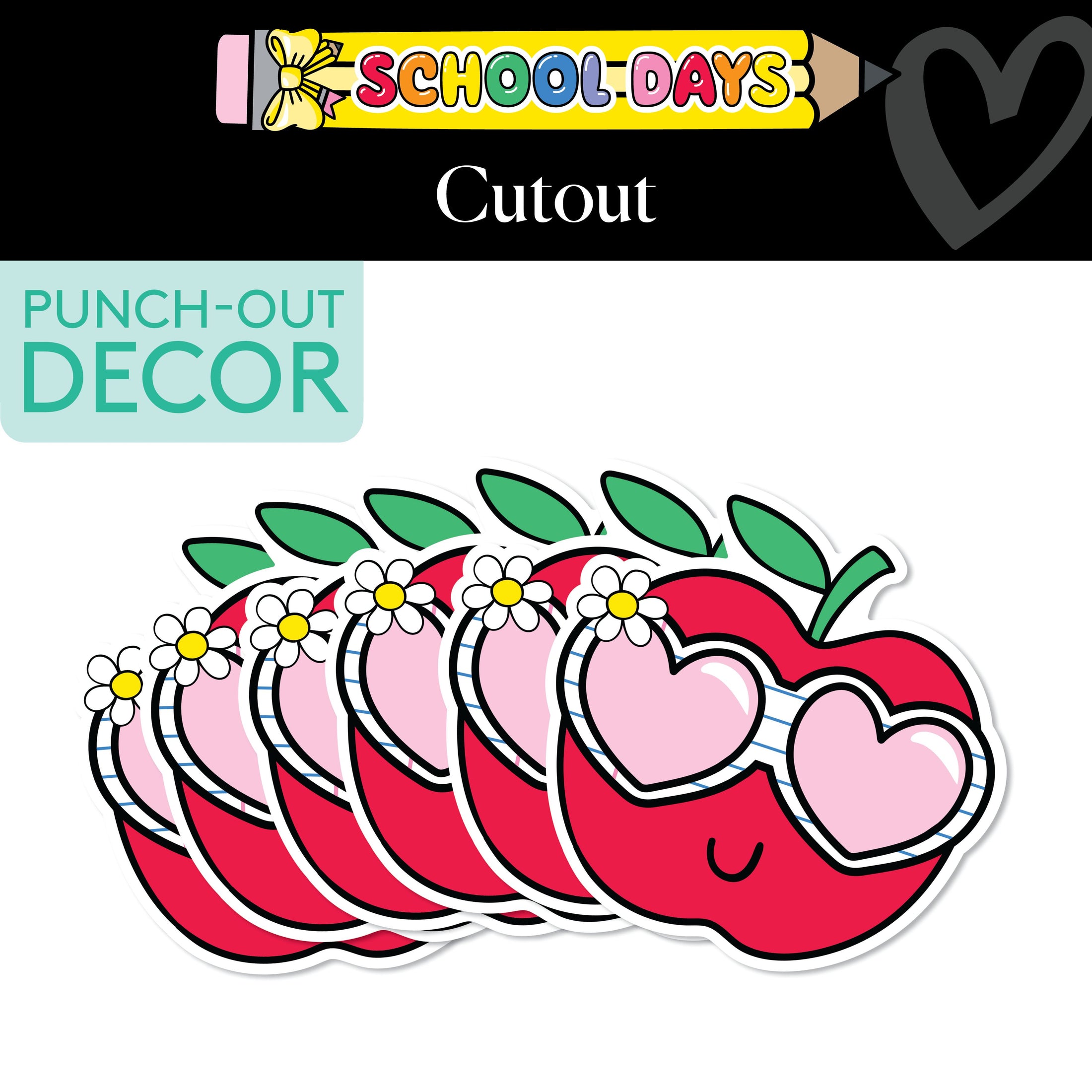Add a burst of color and personality to your classroom with these Bright Apple Bulletin Board Cutouts! Featuring adorable red apples with heart-shaped glasses and playful daisies, these cutouts are perfect for any bulletin board or display. The fun, vibrant design brings a cheerful, welcoming vibe to your classroom, making them an ideal addition to the School Days collection. These cutouts are sure to inspire creativity and positivity while adding major cuteness to your learning space!