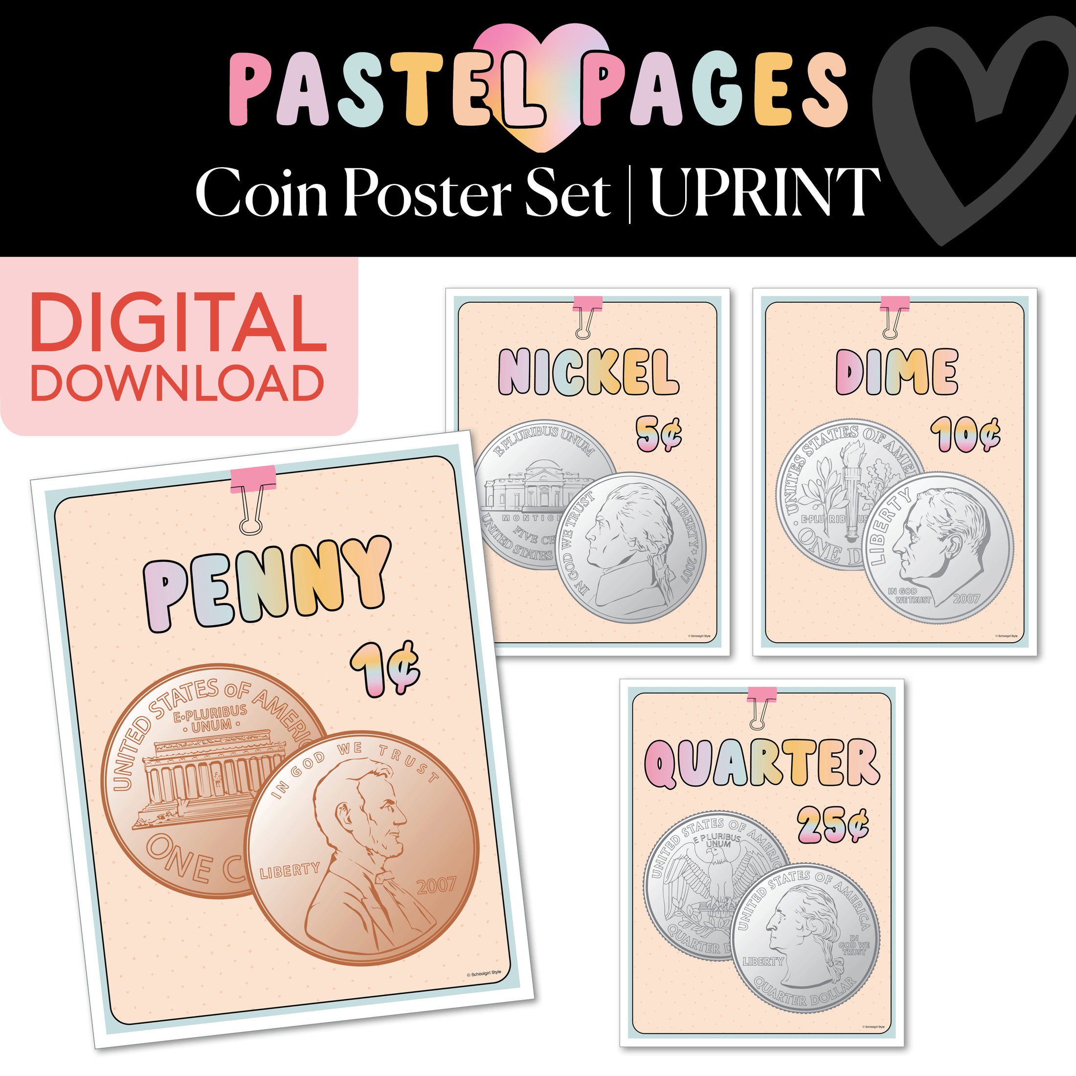 Let’s make learning about coins cute with the Pastel Pages Printable Coin Posters! Featuring the penny, nickel, dime, and quarter, these posters show off each coin’s value with clear images and bold text. The boho pastel design adds some charm while helping students get the hang of money in a fun and easy way!