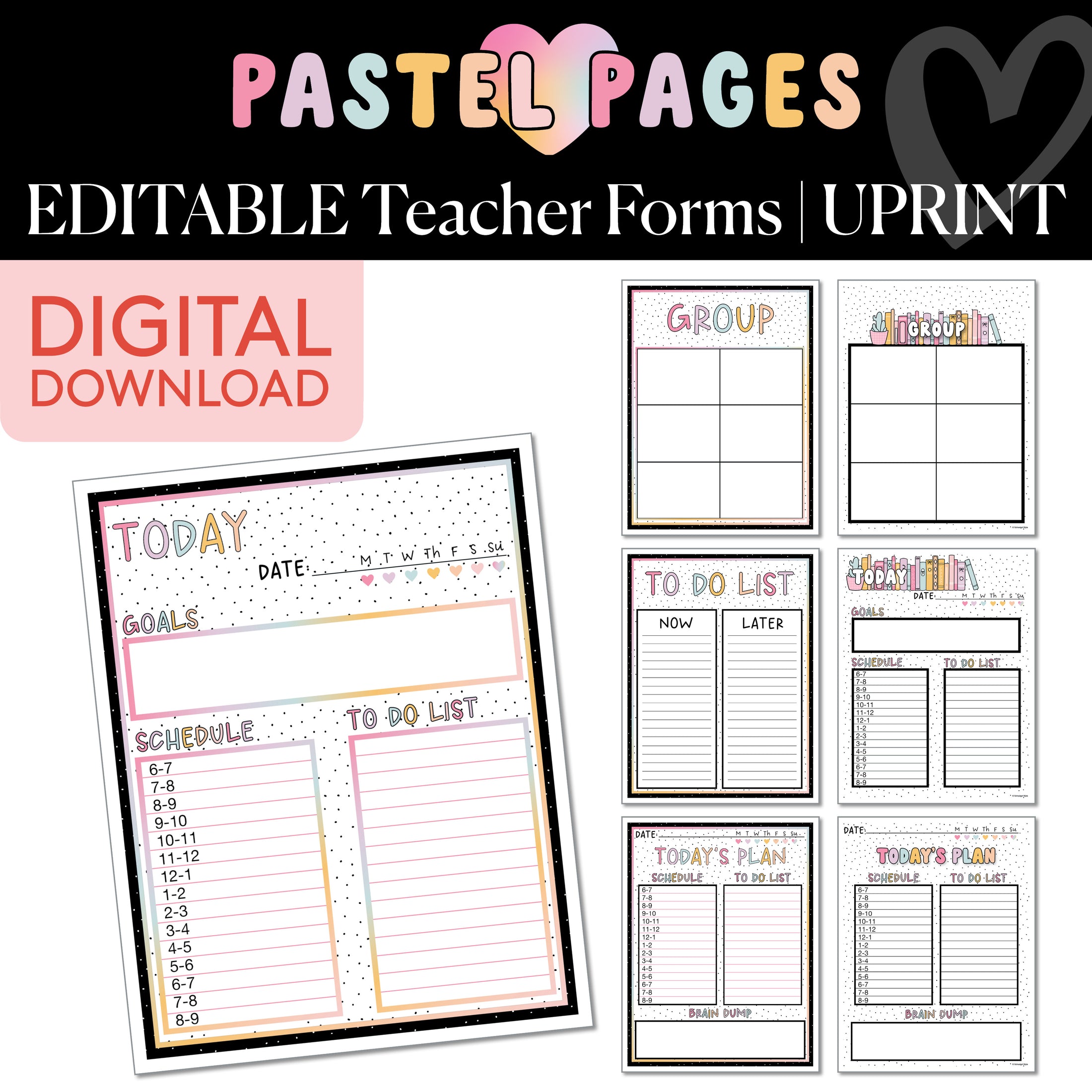 Stay organized and stylish with the Pastel Pages Editable Teacher Forms! From daily schedules and to-do lists to group organizing and goal setting, these forms help keep your day on track. Featuring a calming pastel design, these forms bring both functionality and charm to your teacher planning. Whether you're jotting down goals, planning your day, or organizing groups, these forms will make your classroom management easier and cuter than ever!