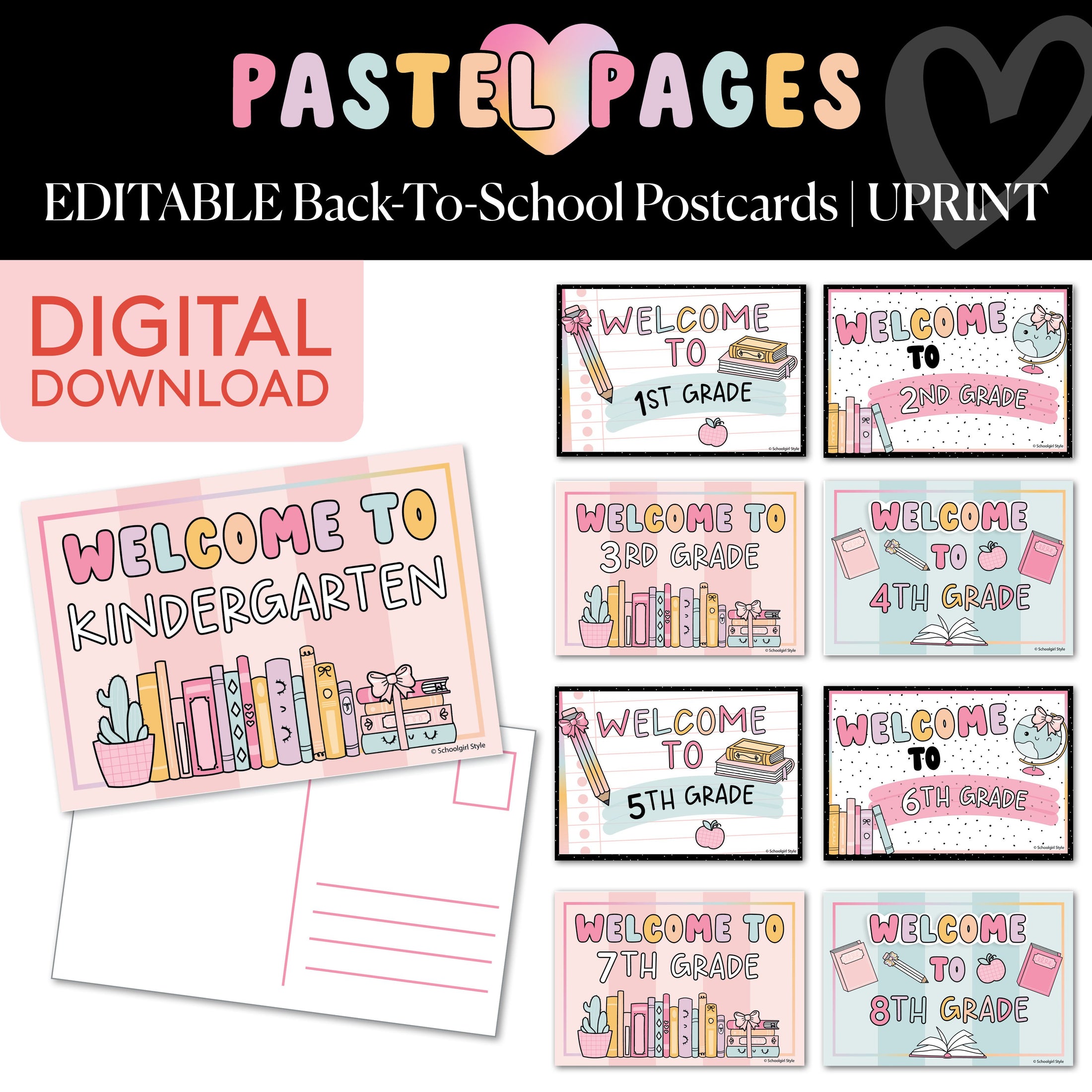 Welcome your students back to school in the cutest way with the Pastel Pages Printable Back to School Postcards! Featuring adorable book stacks, these editable postcards allow you to customize your greeting for each grade. Whether you're welcoming kindergarteners or 8th graders, these stylish pastel postcards add a personal touch to your back-to-school message. Perfect for mailing or handing out, they’re a fun way to kick off the school year!