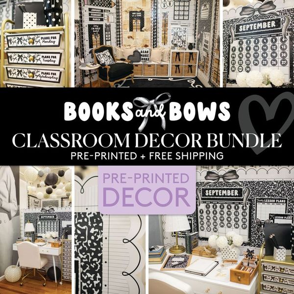 One detail we can’t get enough of this year? Bows! Transform your classroom into a stylish, coquette-inspired space with the timeless charm of Books and Bows! With its chic black-and-white palette, vintage bookish accents, and delicate bows, this collection creates an inviting yet refined vibe where students feel inspired, comfy, and ready to learn. The Books and Bows Collection Pre-Printed Classroom Decor Bundle is your one-stop shop for easy decorating—delivered right to your door, no printing required!