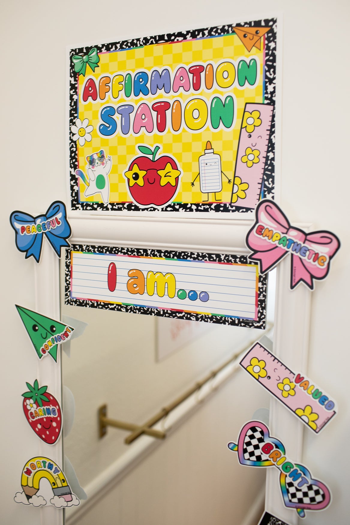 Boost positivity and foster a growth mindset with the School Days Bright Rainbow Affirmation Station! This vibrant, playful display is filled with fun and encouraging affirmations designed to empower students. With colorful, bold lettering and vintage icons like stars, rainbows, and pencils, this station creates a cheerful space where students can reflect on their strengths and embrace positive self-talk. Featuring phrases like "I am strong," "You are kind," and "I am amazing," along with motivational visuals, this station is a wonderful tool for building self-confidence and nurturing a growth mindset in your classroom!