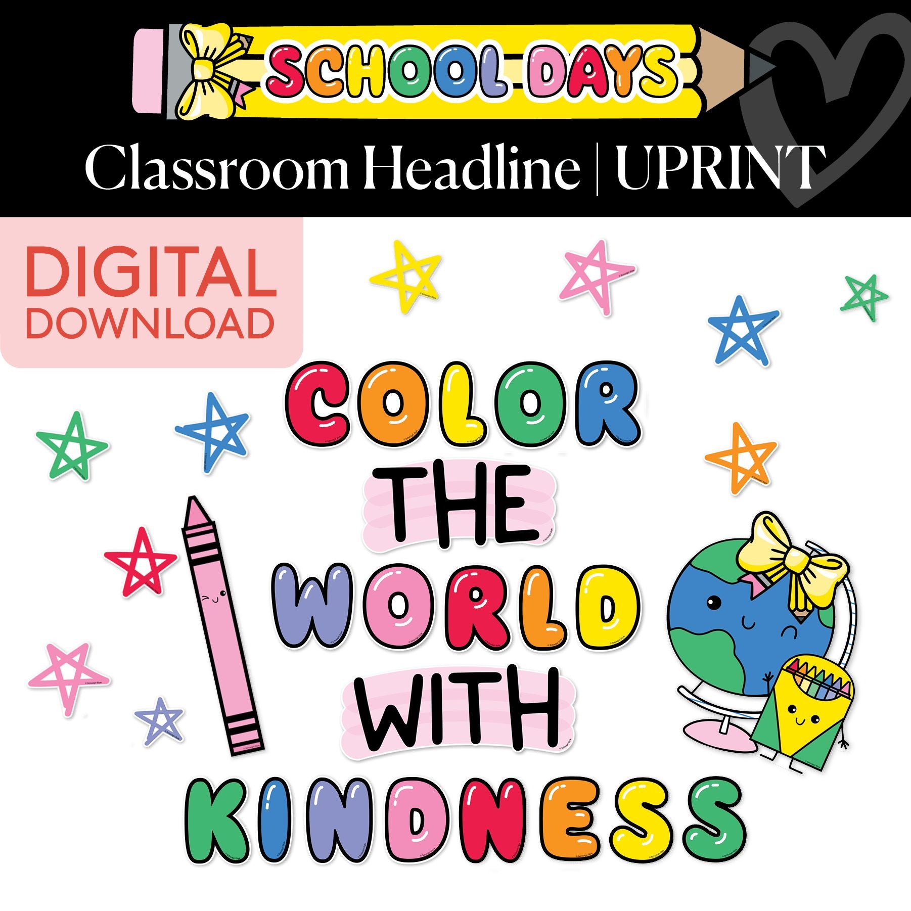 Spreading kindness has never been so cute or so colorful! This vibrant "Color the World With Kindness" Classroom Headline is sure to bring a smile to every face. With its bold, cheerful letters, playful pink crayon, and adorable globe, it’s the perfect way to brighten your classroom and inspire positivity. A perfect mix of color, fun, and a dash of vintage nostalgia—this headline is ready to spread all the good vibes!