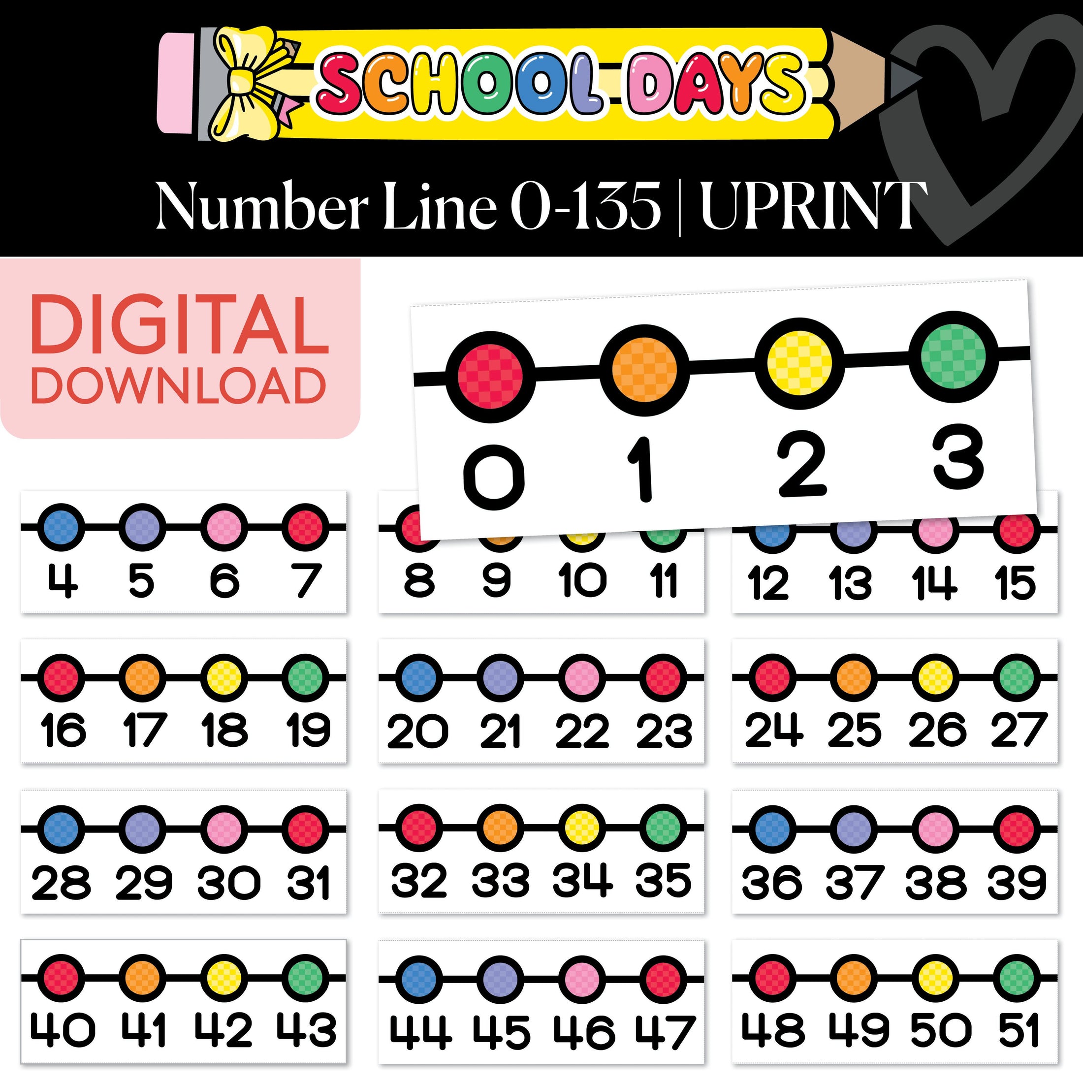 Help your students visualize numbers and build their counting skills with the School Days Printable Number Line 0-135! Featuring bright rainbow colored, clear, easy-to-read number segments, this number line is perfect for building number sense and reinforcing counting skills!