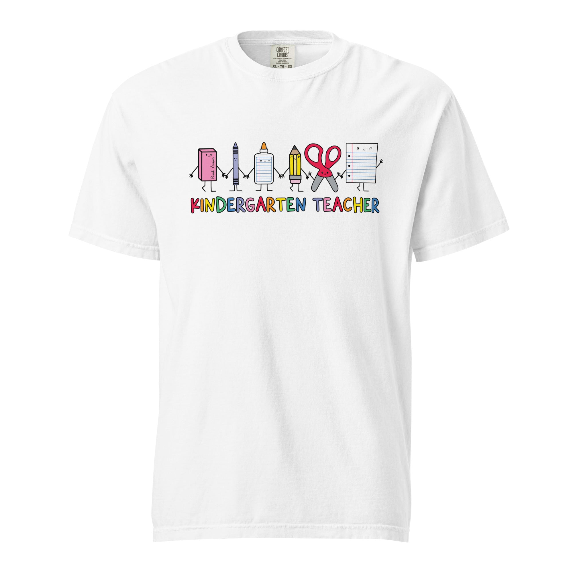 Celebrate the magic of Kindergarten with this vintage-inspired t-shirt from our School Days collection. Featuring bright retro rainbow colors and an adorable crew of school supplies holding hands, this tee brings the perfect mix of nostalgia and joy to your classroom wardrobe. Whether you're rocking it on the first day, field trips, or casual Fridays, it's sure to spark smiles from your students and fellow teachers alike!
