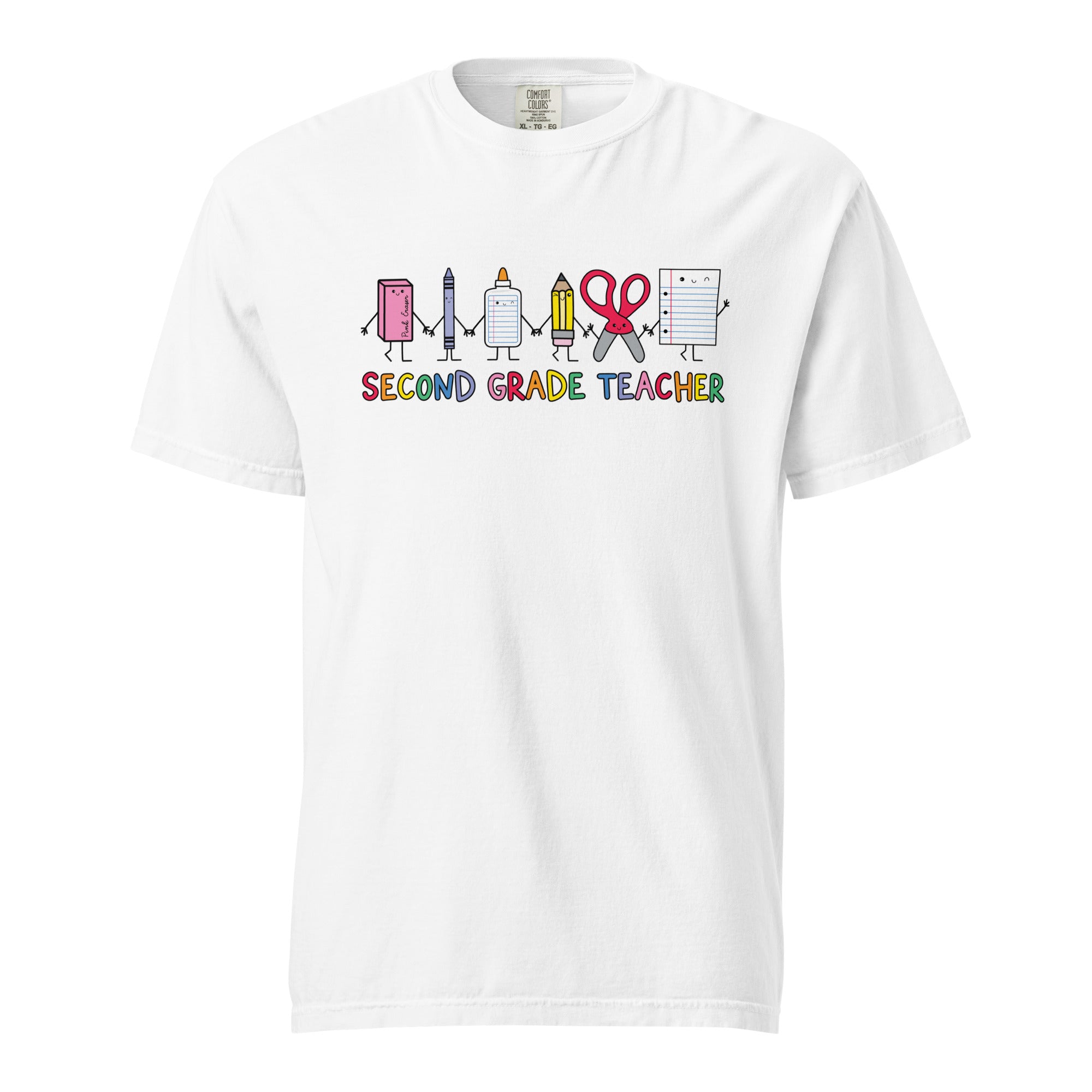 Celebrate the magic of Second Grade with this vintage-inspired t-shirt from our School Days collection. Featuring bright retro rainbow colors and an adorable crew of school supplies holding hands, this tee brings the perfect mix of nostalgia and joy to your classroom wardrobe. Whether you're rocking it on the first day, field trips, or casual Fridays, it's sure to spark smiles from your students and fellow teachers alike!