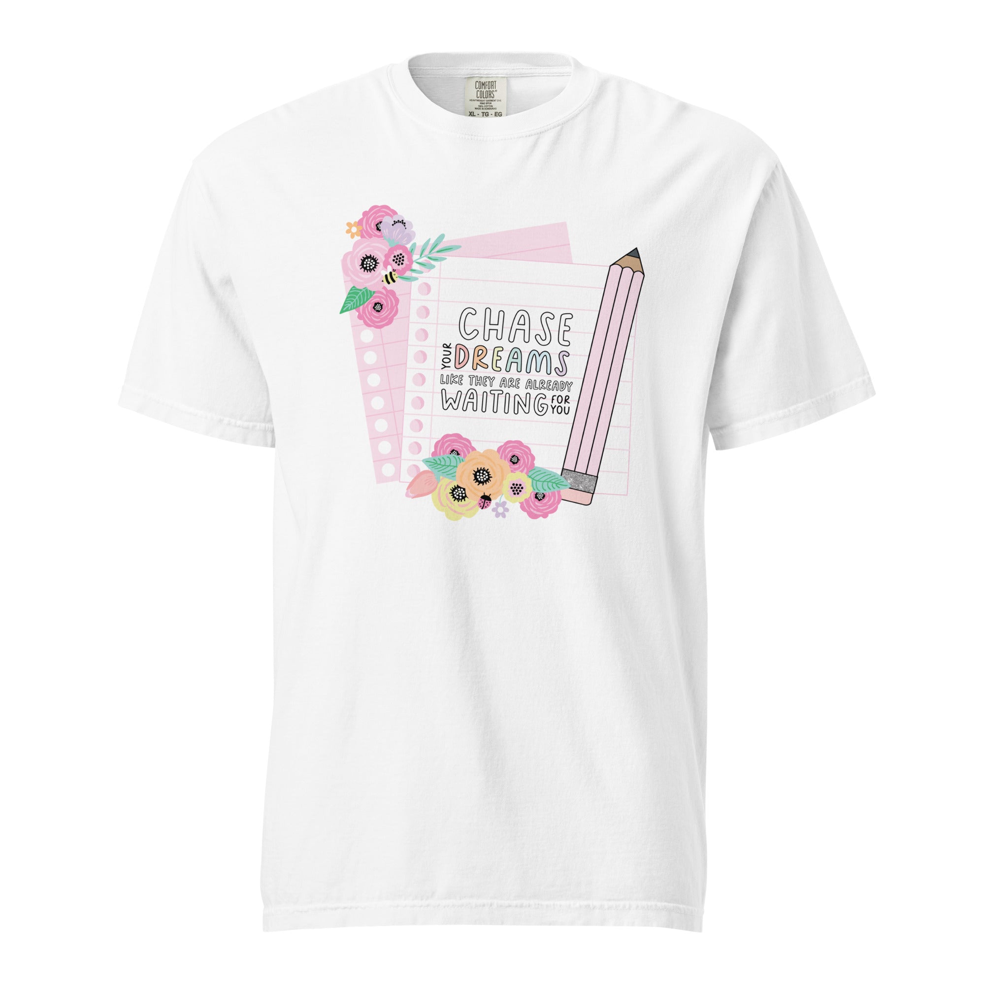 Inspire your students (and yourself!) with this motivational pastel tee that reads, “Chase your dreams like they are already waiting for you.” With notepad and pencil graphics plus vintage florals, it’s ideal for elementary teachers and dreamers alike.