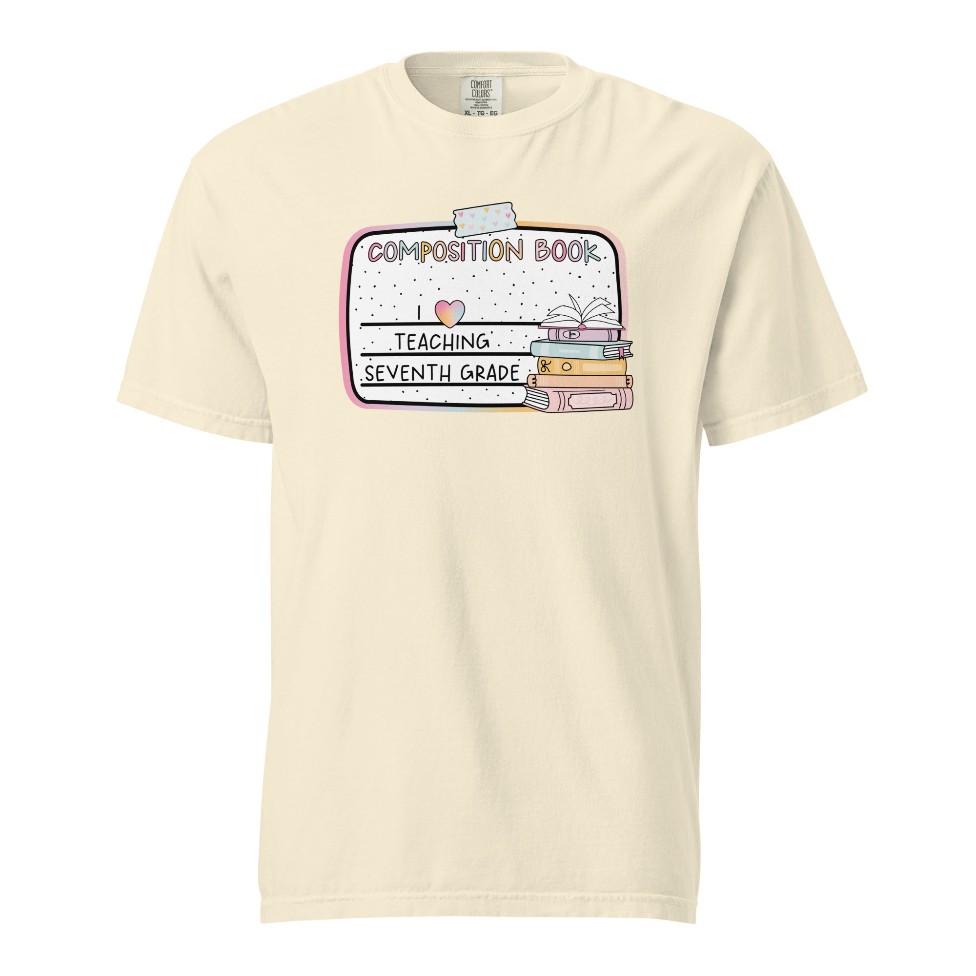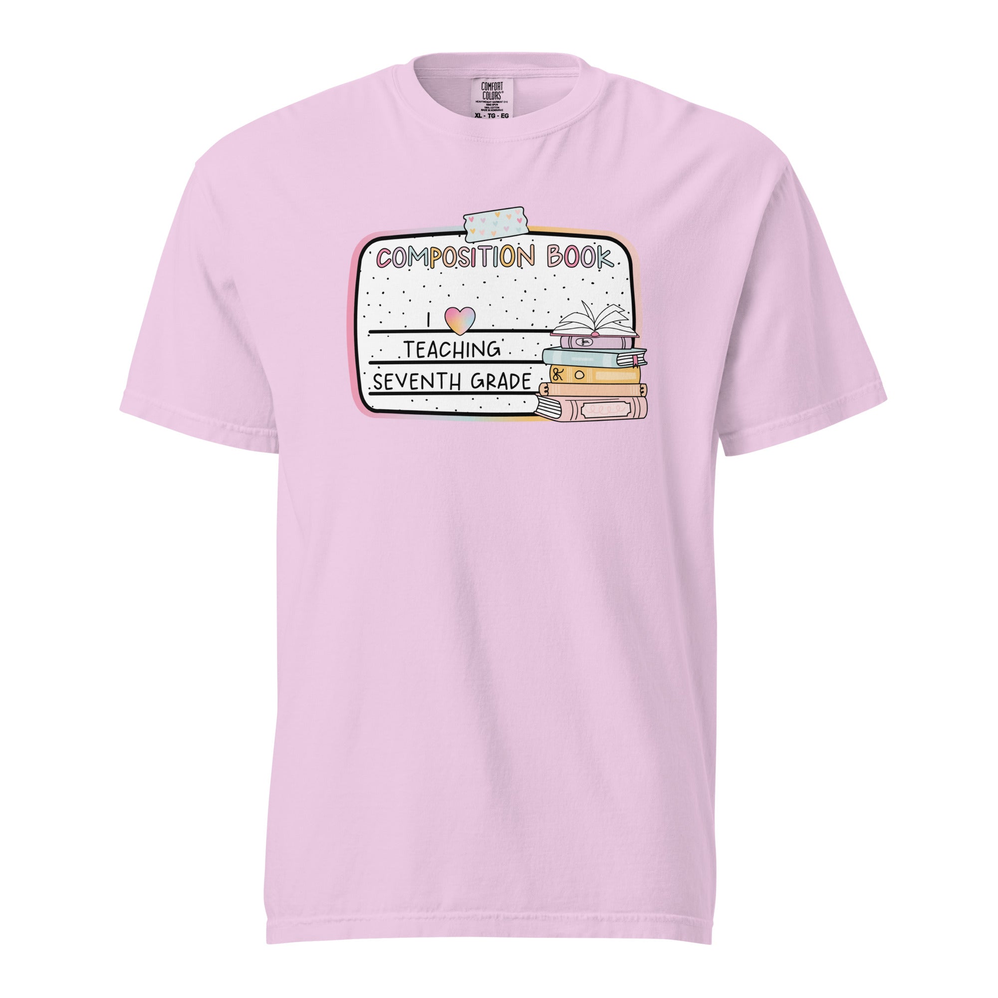 A boho pastel composition book design meets a stack of storybook favorites in this sweet teacher tee. With the line I love teaching seventh grade, it’s ideal for grade-level pride and bookish energy.