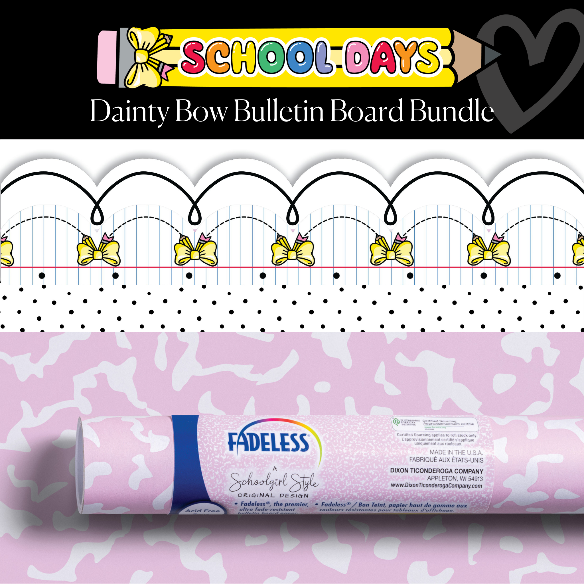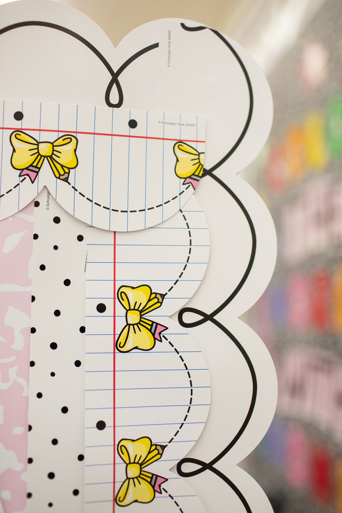 - Study Hall Pencil Bows Border: 22" x 3" (21 strips) for a total of 39 feet of border; gloss finish