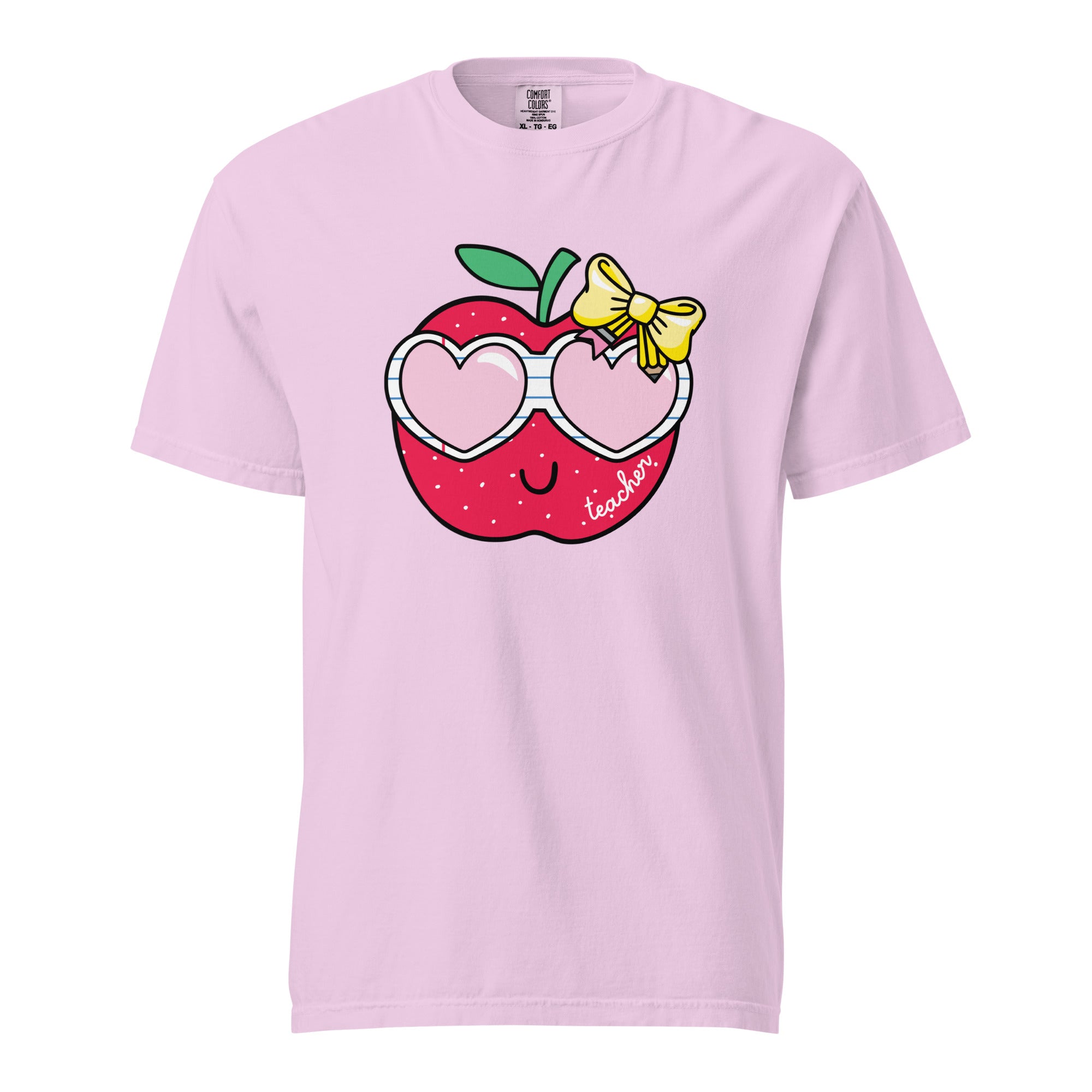 Meet your new favorite tee—a sweet apple in heart-shaped sunnies, striped frames, and a bright yellow bow. With a hand-lettered “teacher” on the bottom and a whole lot of charm, this design is made for educators who love big, teach boldly, and look adorable doing it.