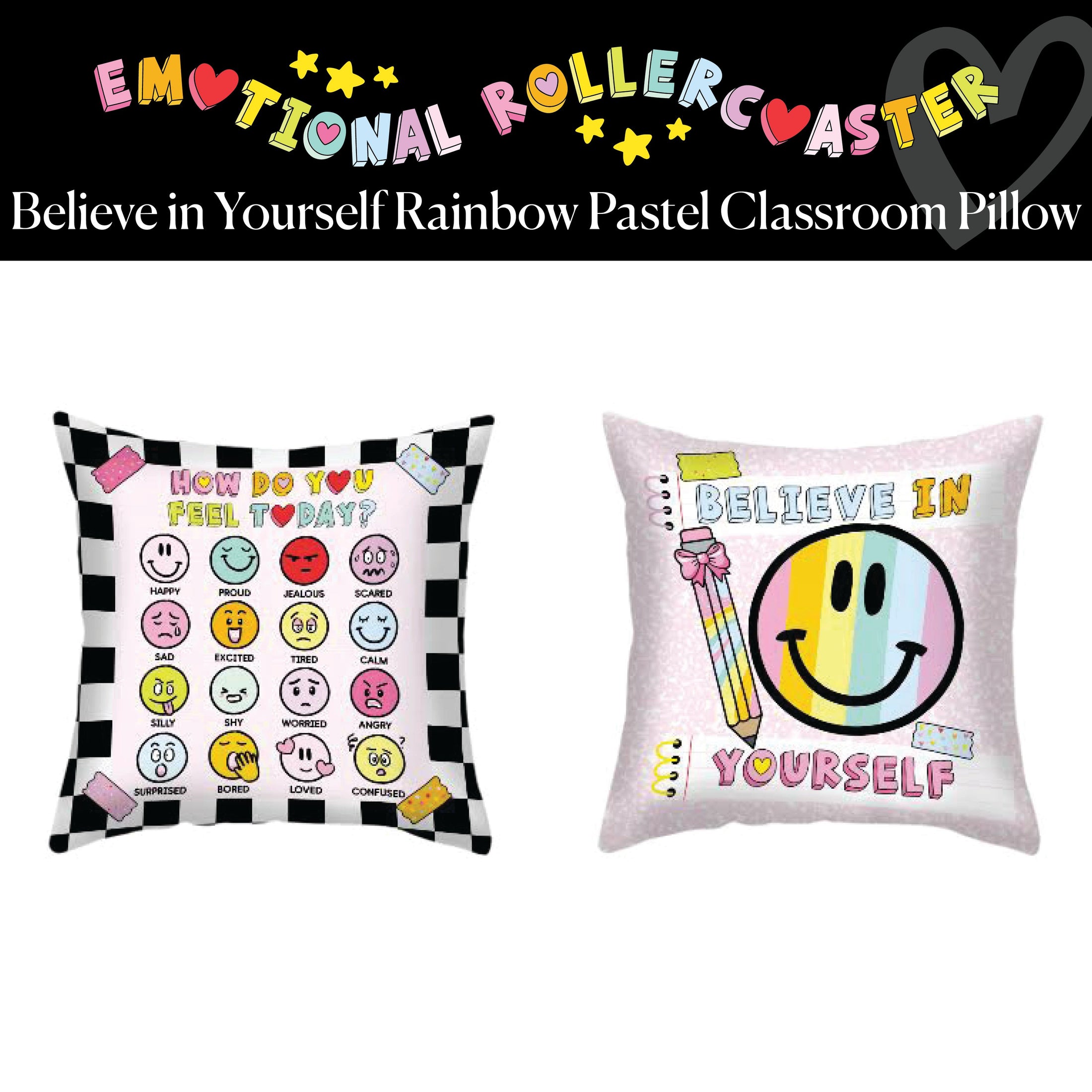 Add comfort and positivity to your classroom with the Believe In Yourself Rainbow Pastel Classroom Pillow! Perfect for creating a cozy reading nook or adding a cheerful touch to any corner, this pillow features a playful rainbow pastel smiley face on one side with an uplifting "Believe In Yourself" message. The reverse side has a vibrant "How Do You Feel Today?" design with colorful smiley faces, encouraging emotional expression and reflection. This cozy pillow beautifully complements the Emotional Rollercoaster collection, creating a positive, supportive space where students can relax, reflect, and feel motivated!