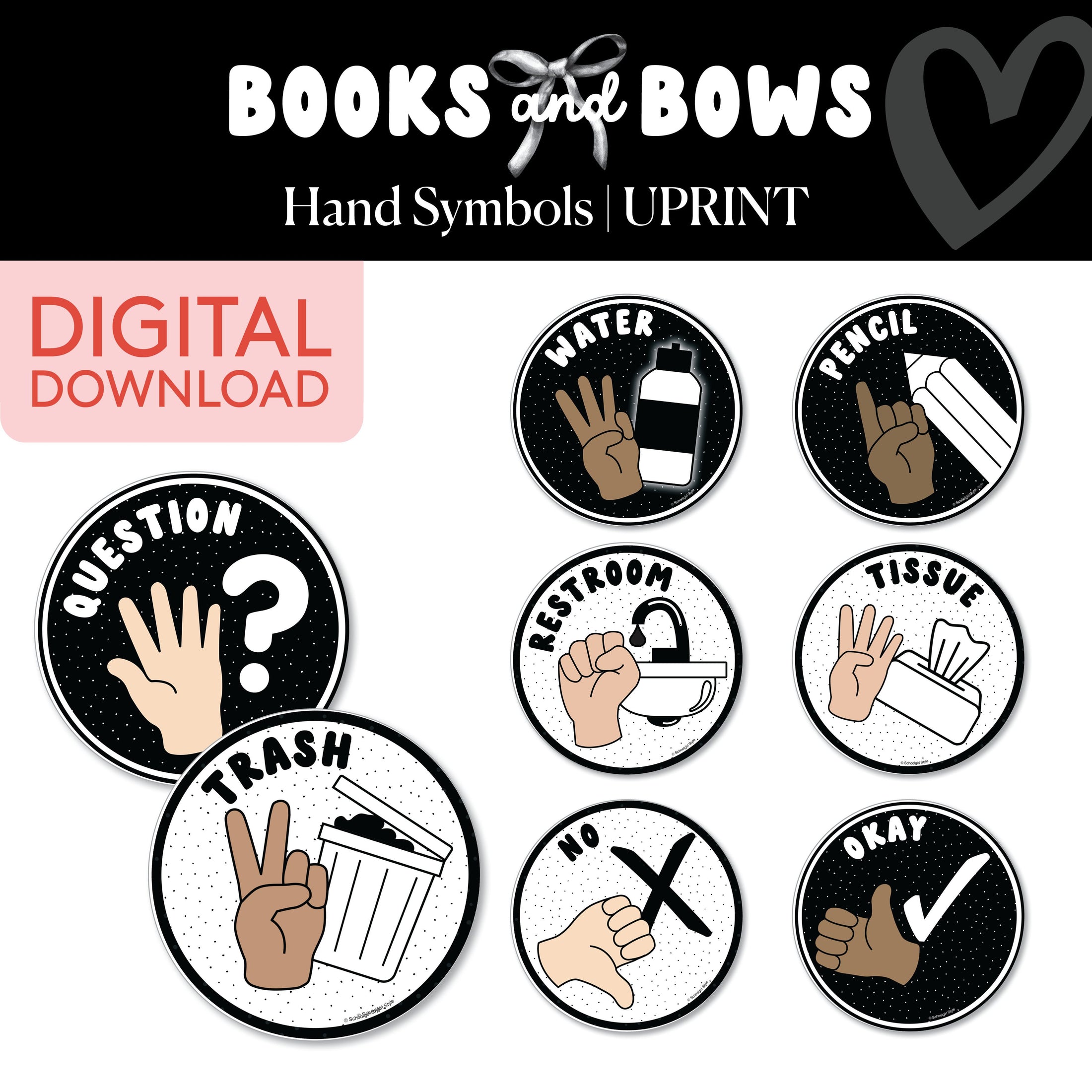 Make classroom communication simple and stylish with the Books and Bows Printable Hand Symbols! These easy-to-understand symbols cover everything from asking a question to needing a tissue or restroom break. With a bold black-and-white design, these symbols are perfect for keeping things organized and helping students quickly signal their needs in a fun, visual way!