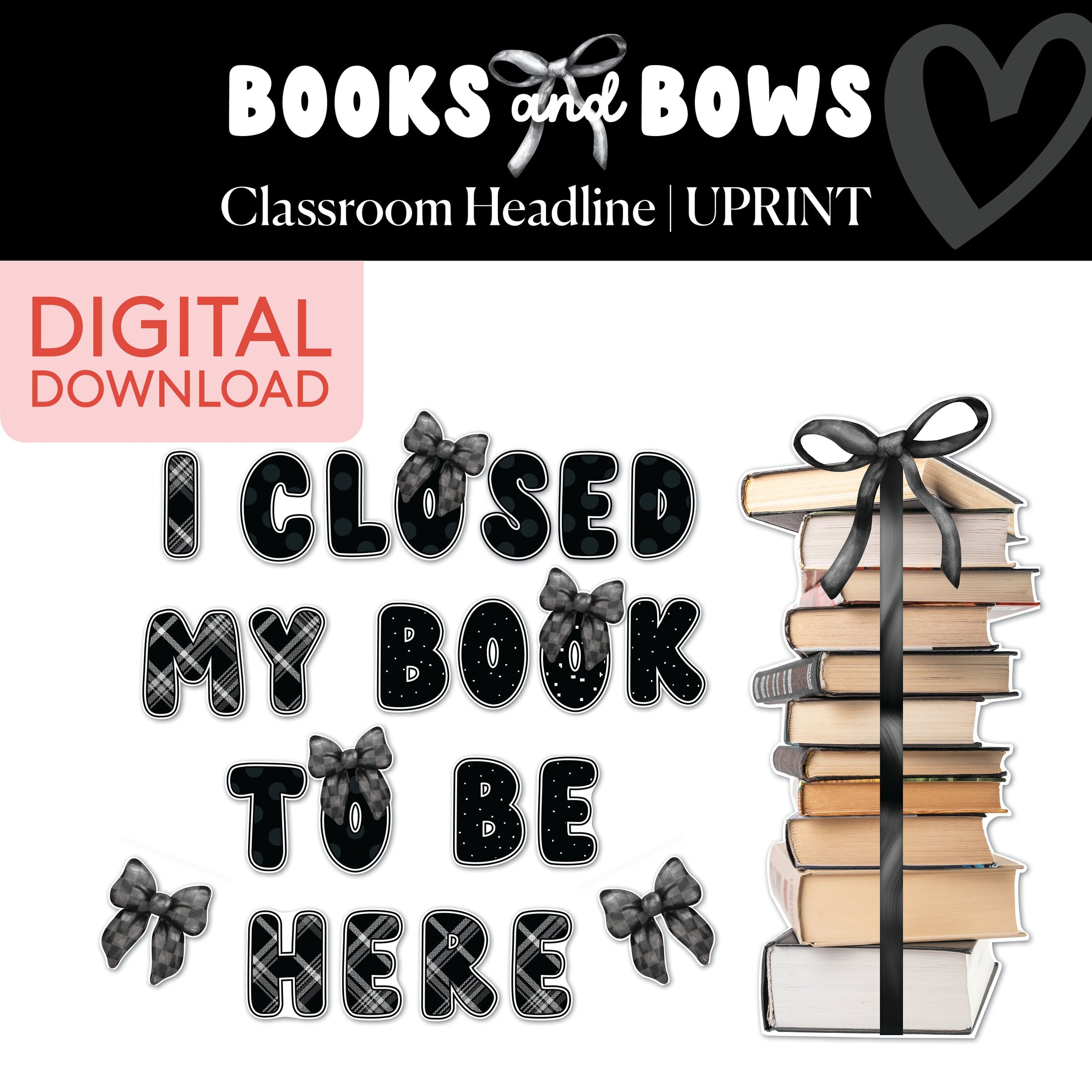 Make a statement in your classroom with the Books and Bows Classroom Headline! Featuring the fun phrase “I Closed My Book to Be Here” paired with a stack of vintage books and chic black ribbon bows, this headline adds a playful yet stylish touch to your space. It’s the perfect way to remind students that learning is where the real adventure begins!