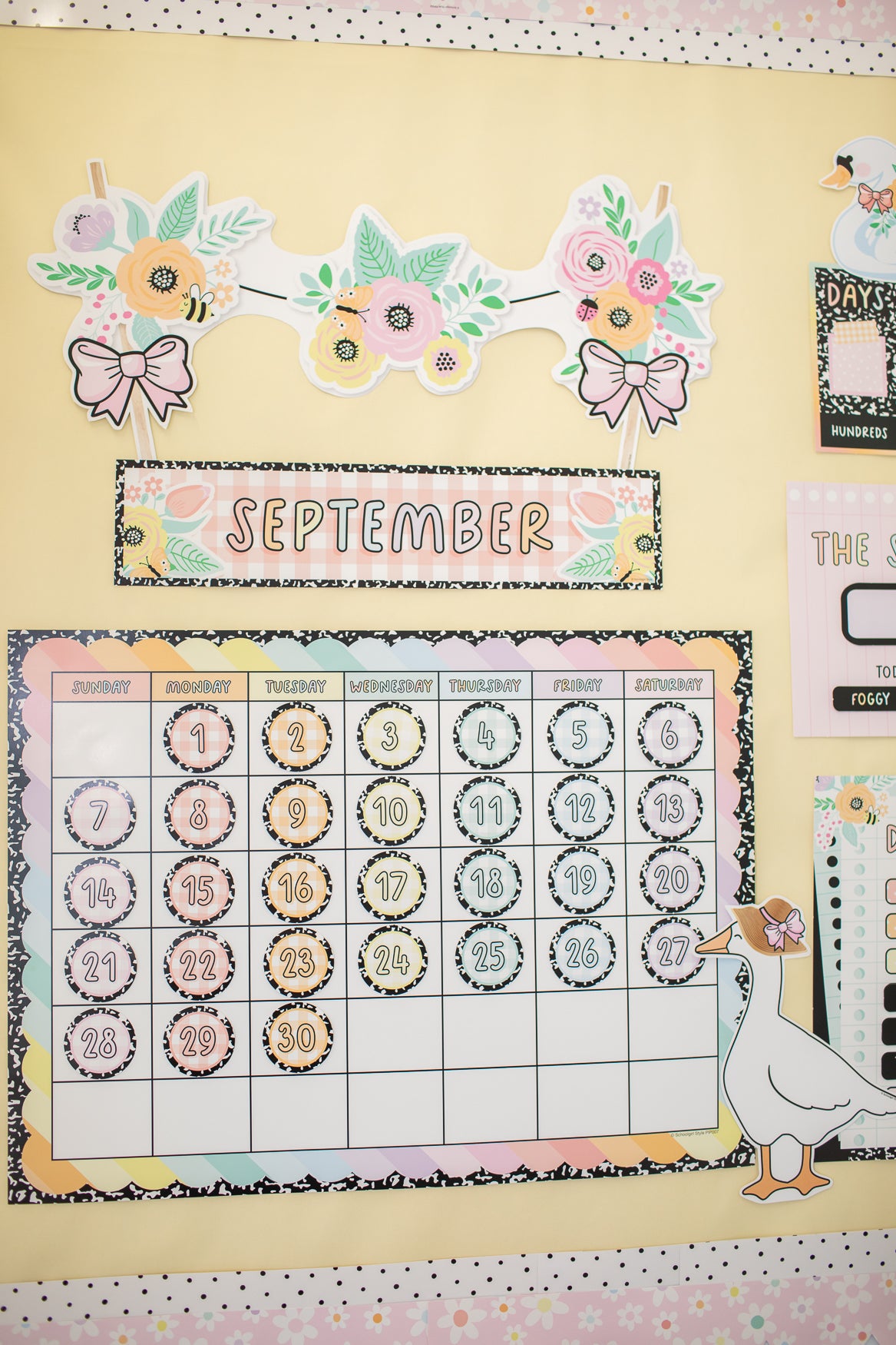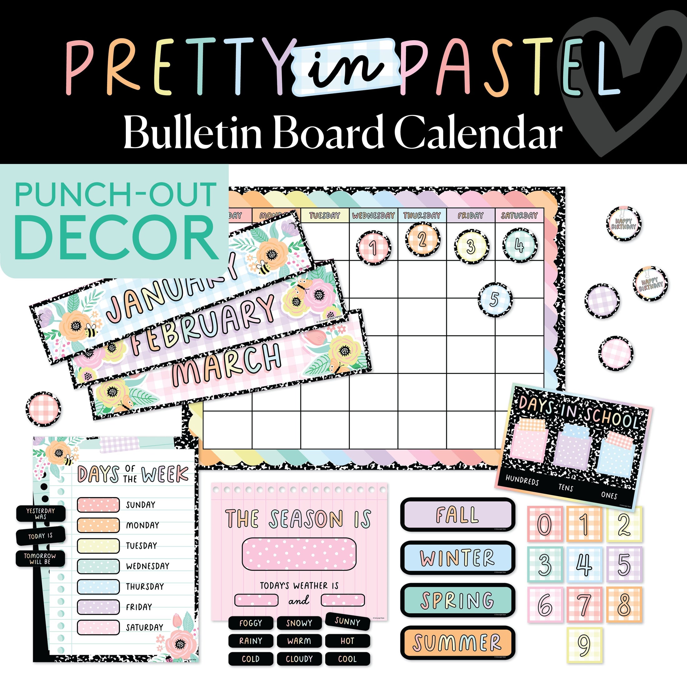Keep students engaged with this Pastel Bulletin Board Calendar! Featuring movable pieces and a soft pastel color palette, this interactive calendar makes learning about dates, seasons, and weather both fun and educational. With its delicate florals, pastel hues, and playful details, it adds a cheerful, calming touch to your classroom routine. This calendar perfectly complements the Pretty in Pastel collection, helping create a welcoming space where learning is both inspiring and enjoyable!