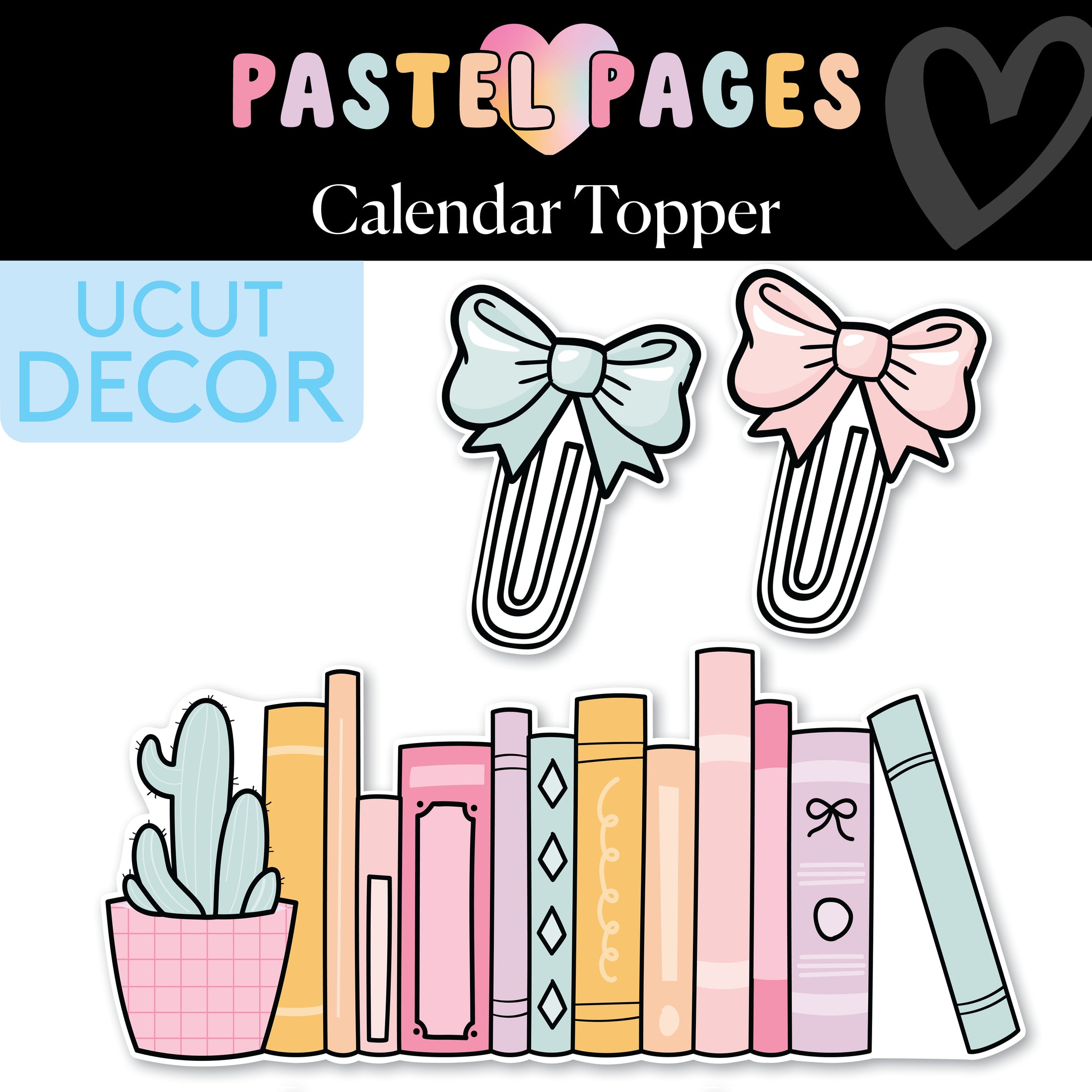 This Pastel Pages calendar topper is the sweetest way to start the month with cozy, bookish charm! Featuring a pastel row of book spines and two oversized paperclip cutouts—each topped with a darling pastel bow—this UCut decor adds a whimsical, layered look to your calendar display. With soft colors and literary flair, it’s the perfect finishing touch for creating a warm, inviting classroom vibe all year long!