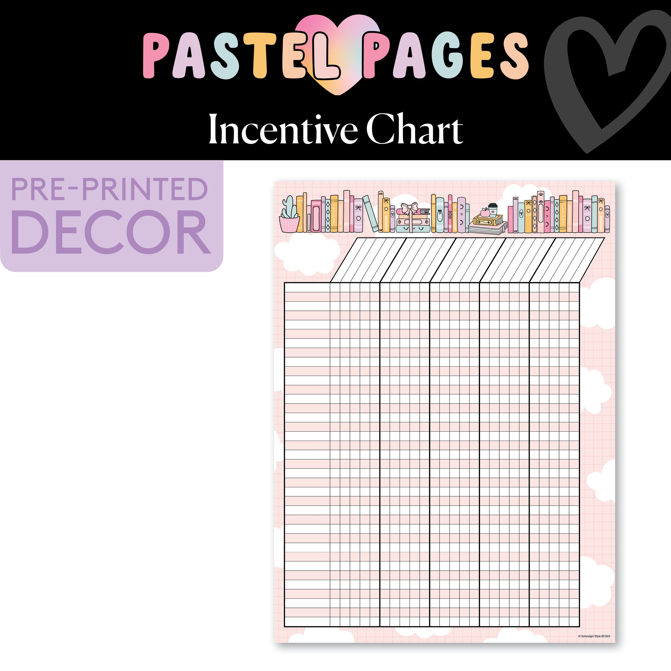 Keep your students motivated and your classroom management on point with the Pastel Incentive Chart from the Pastel Pages collection! Featuring a soft pink grid, dreamy clouds, and pastel book spines across the top, this chart is a fun and visually engaging way to track progress, reinforce positive behavior, and bring a sweet, supportive vibe to your space!