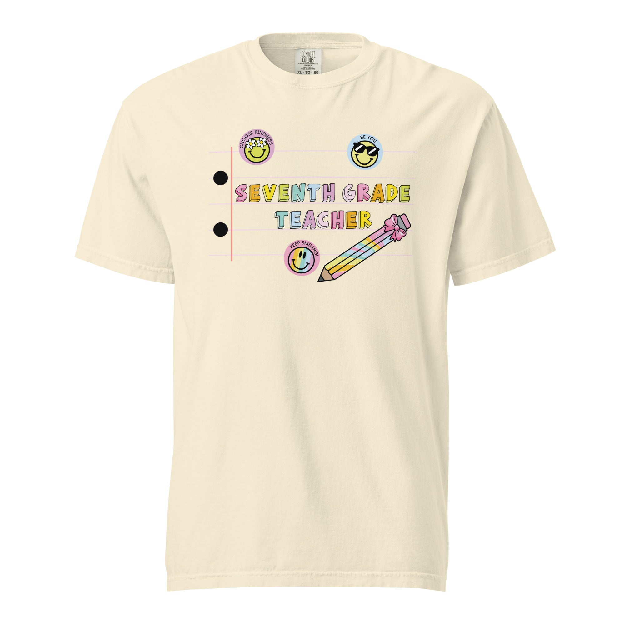 Let your class know emotions matter with this bold Seventh Grade Teacher tee filled with cheerful icons and pastel pops of color. A perfect match for educators who teach with both intellect and empathy.