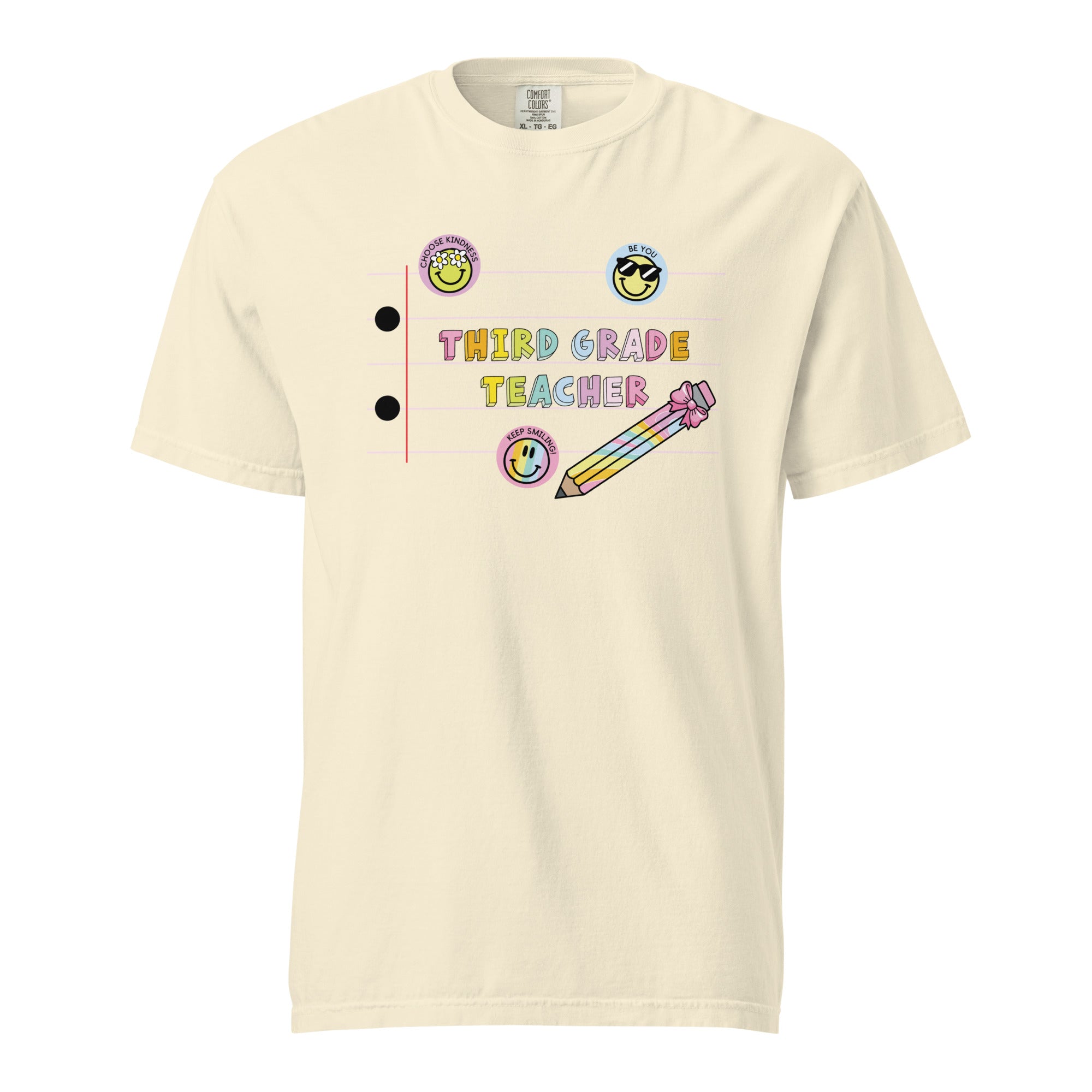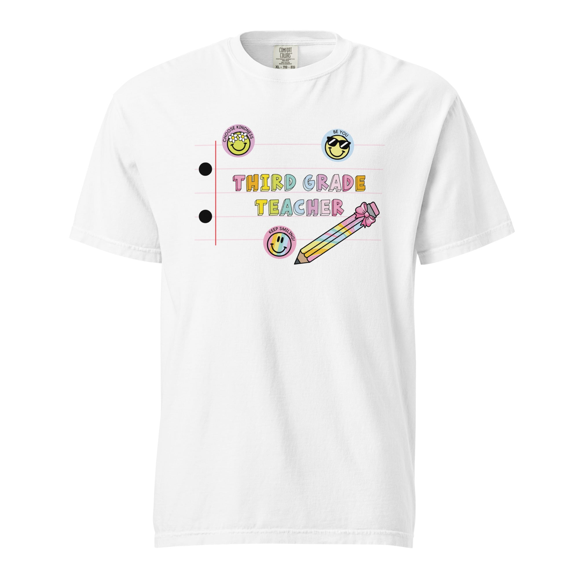 Celebrate the power of positivity in your classroom with this playful Third Grade Teacher shirt. With pastel graphics and smiley face flair, it’s made to spread joy from morning bell to dismissal.