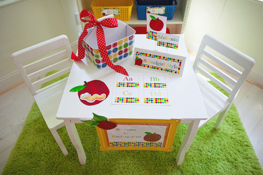 Schoolgirl Style has created the nameplates in 2 designs - polka dots and an apple in the corner OR you can choose just the polka dots! Nameplates are also EDITABLE. Click in the box, type away, and then print!
