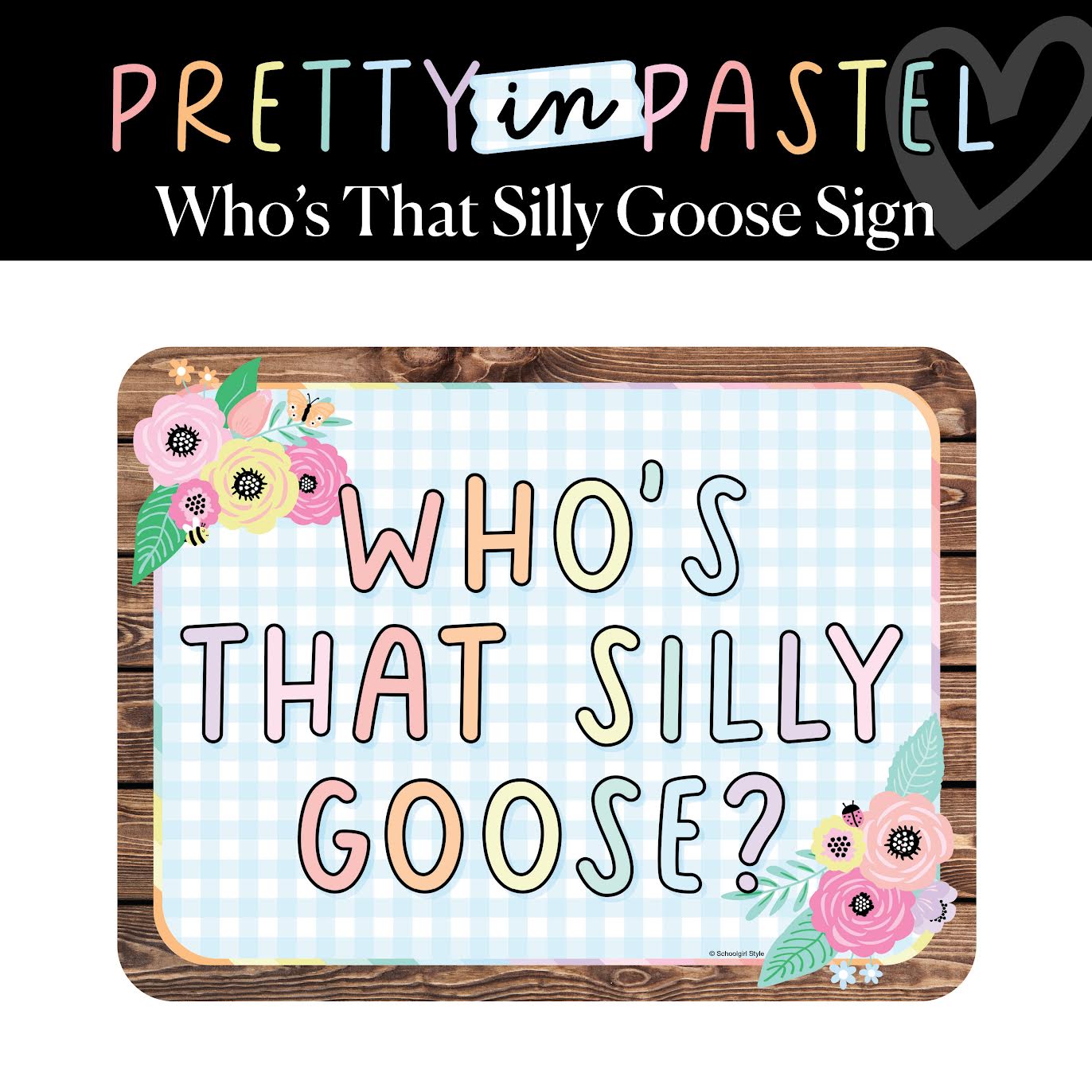 All of your students will want to be the silly goose with this adorable Printable “Who’s That Silly Goose?” Sign! Featuring soft pastel lettering, sweet floral details, and a blue gingham background framed in rustic wood, this playful sign adds charm and personality to any classroom space. Perfect for a student spotlight, dramatic play area, or just a fun little classroom moment—because who wouldn’t want to be the silly goose of the day?