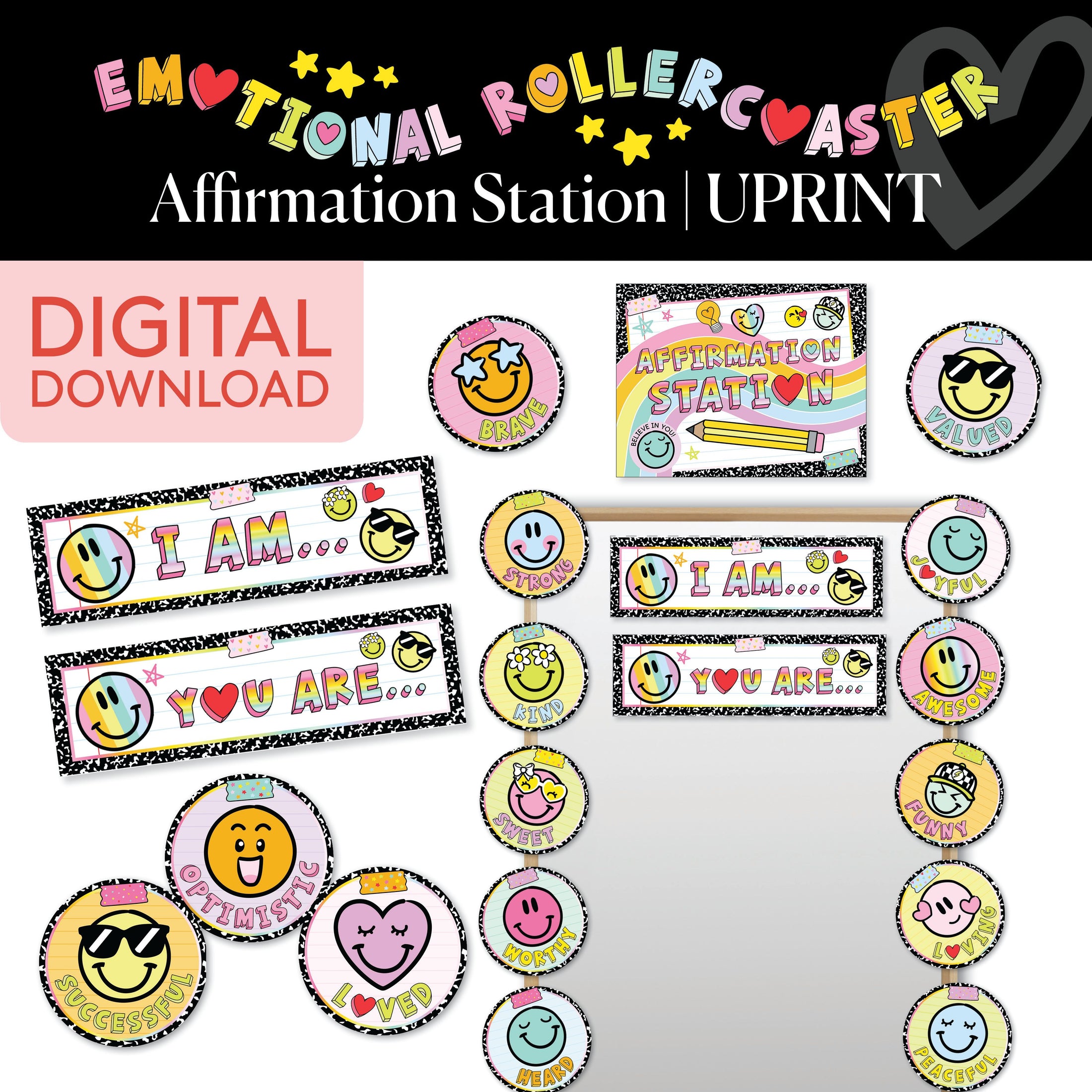 Boost positivity and foster a growth mindset with the Rainbow Pastel Affirmation Station! Featuring bold, uplifting affirmations with colorful smiley faces and fun pastel backgrounds, this station is the perfect spot to encourage students to reflect on their strengths and build self-confidence. From “I am strong” to “You are awesome,” these affirmations create a positive, empowering space that celebrates emotional growth. This affirmation station beautifully complements the Emotional Rollercoaster collection, helping create a supportive environment where students are motivated to believe in themselves and their abilities!