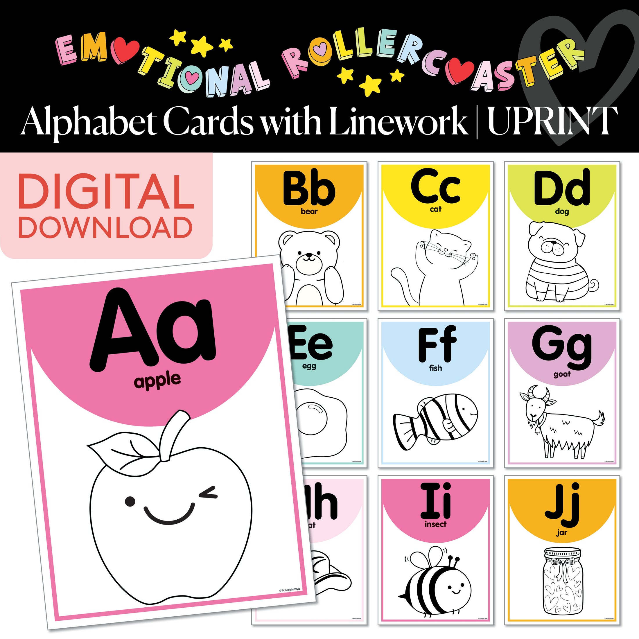 Make learning the alphabet fun with these Rainbow Pastel Alphabet Cards! Each letter is paired with a cute line drawing, perfect for connecting letters to sounds. Designed to complement the Emotional Rollercoaster collection, these cards add a pop of rainbow charm to your classroom while helping little learners get excited about letters!
