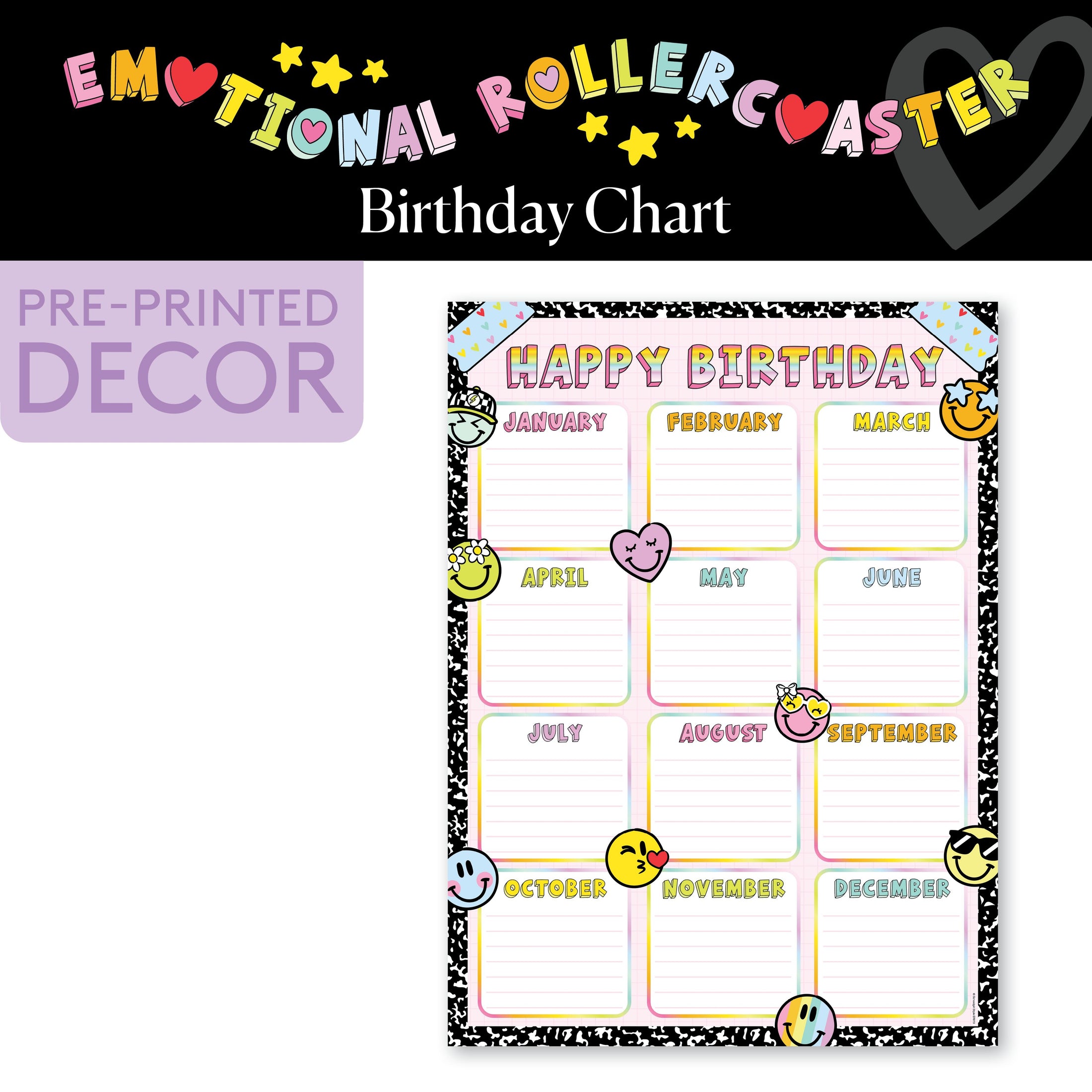 Celebrate every student’s special day with the Rainbow Pastel Birthday Chart! With its fun smiley faces, pastel colors, and playful design, this chart is the perfect way to keep track of birthdays in a cheerful and colorful way. Each month features a cute smiley and plenty of space to write down names, making it easy to celebrate your students all year long. It perfectly complements the Emotional Rollercoaster collection, adding an extra dose of joy and positivity to every birthday celebration!
