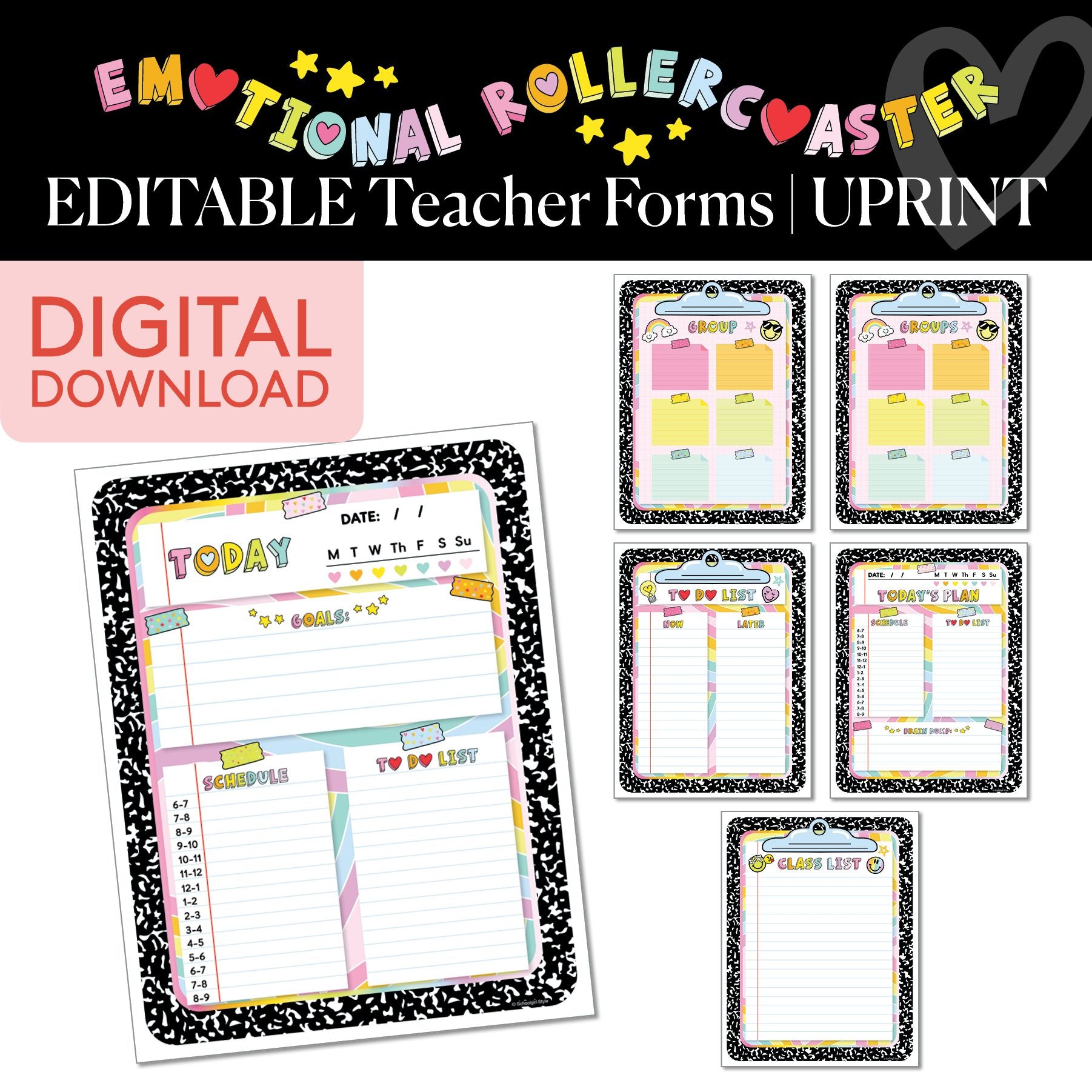 Stay organized and stylish with the Emotional Rollercoaster Editable Teacher Forms! From daily schedules and to-do lists to group organizing and goal setting, these forms help keep your day on track. Featuring a rainbow pastel design, these forms bring both functionality and charm to your teacher planning. Whether you're jotting down goals, planning your day, or organizing groups, these forms will make your classroom management easier and cuter than ever!