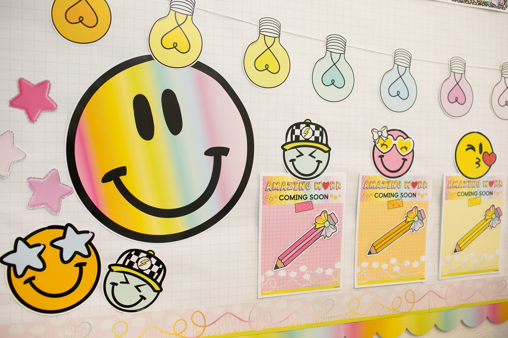 these Rainbow Pastel Smiley Face Extra Large Cutouts are here to bring big smiles and bright colors to your classroom! With their playful rainbow pastel gradient and fun details like starry eyes and flower crowns, these cutouts are perfect for adding a pop of positivity to any space. Use them to decorate bulletin boards, enhance displays, or simply spread good vibes around the room. They perfectly complement the Emotional Rollercoaster collection, bringing even more fun and emotional growth to your classroom’s colorful journey!