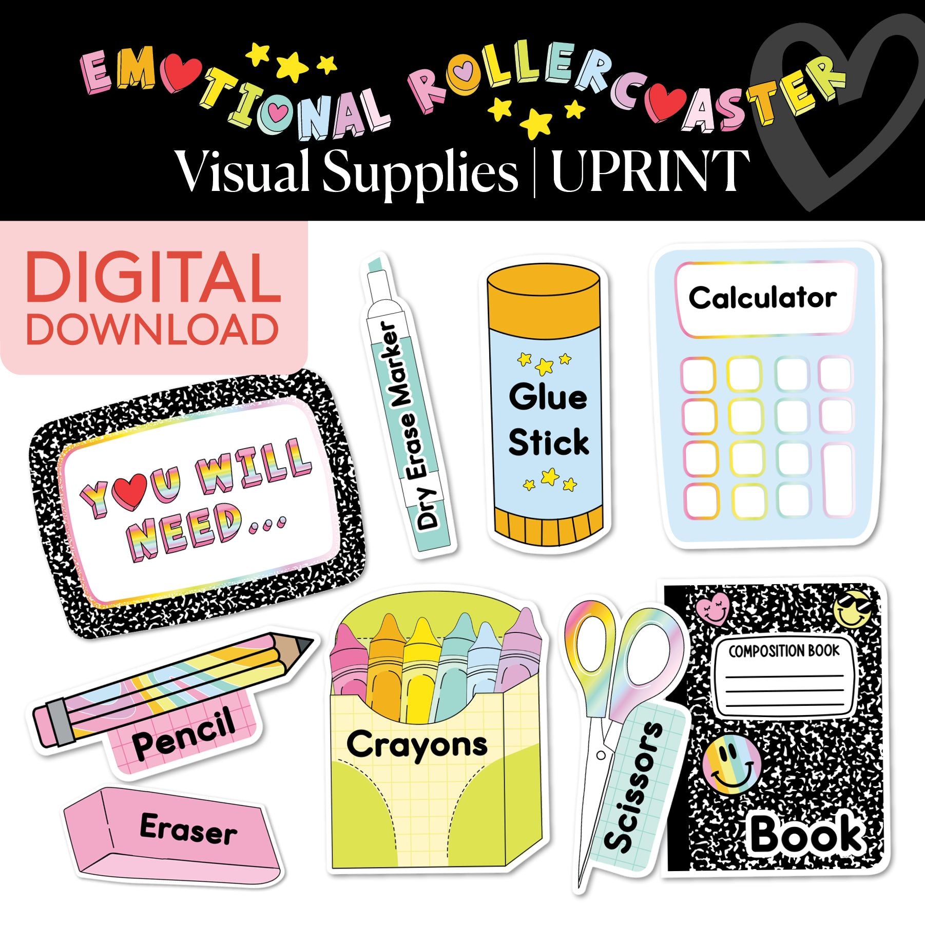 Whether you're letting students know what they’ll need for a lesson or just organizing your materials, these Rainbow Pastel Emotional Rollercoaster Visual Supplies make it easy to highlight supplies like pencils, crayons, scissors, and more. Clear, fun, and functional—perfect for keeping your classroom running smoothly and stylishly!