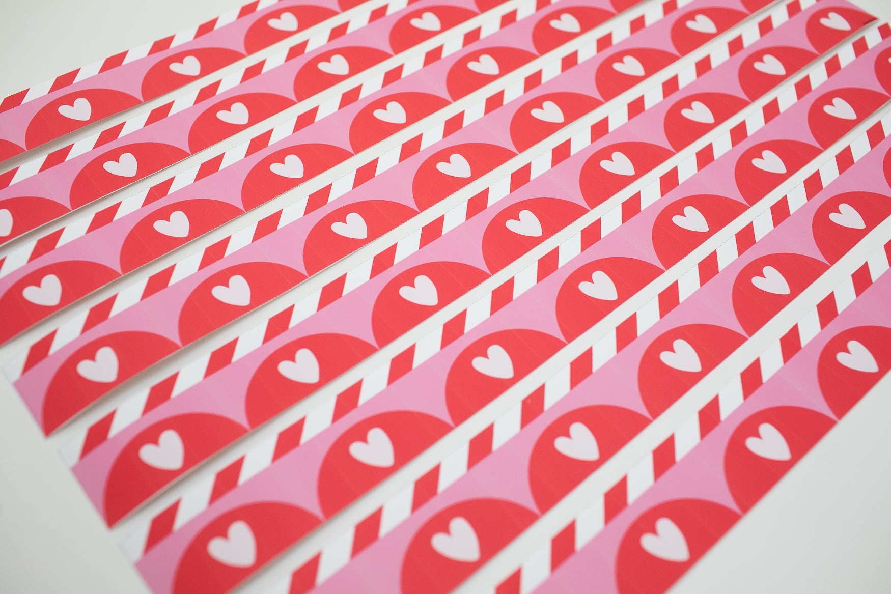 - Four printed Faux Scallop Heart border sheets; seven strips per sheet (requires cutting before displaying)