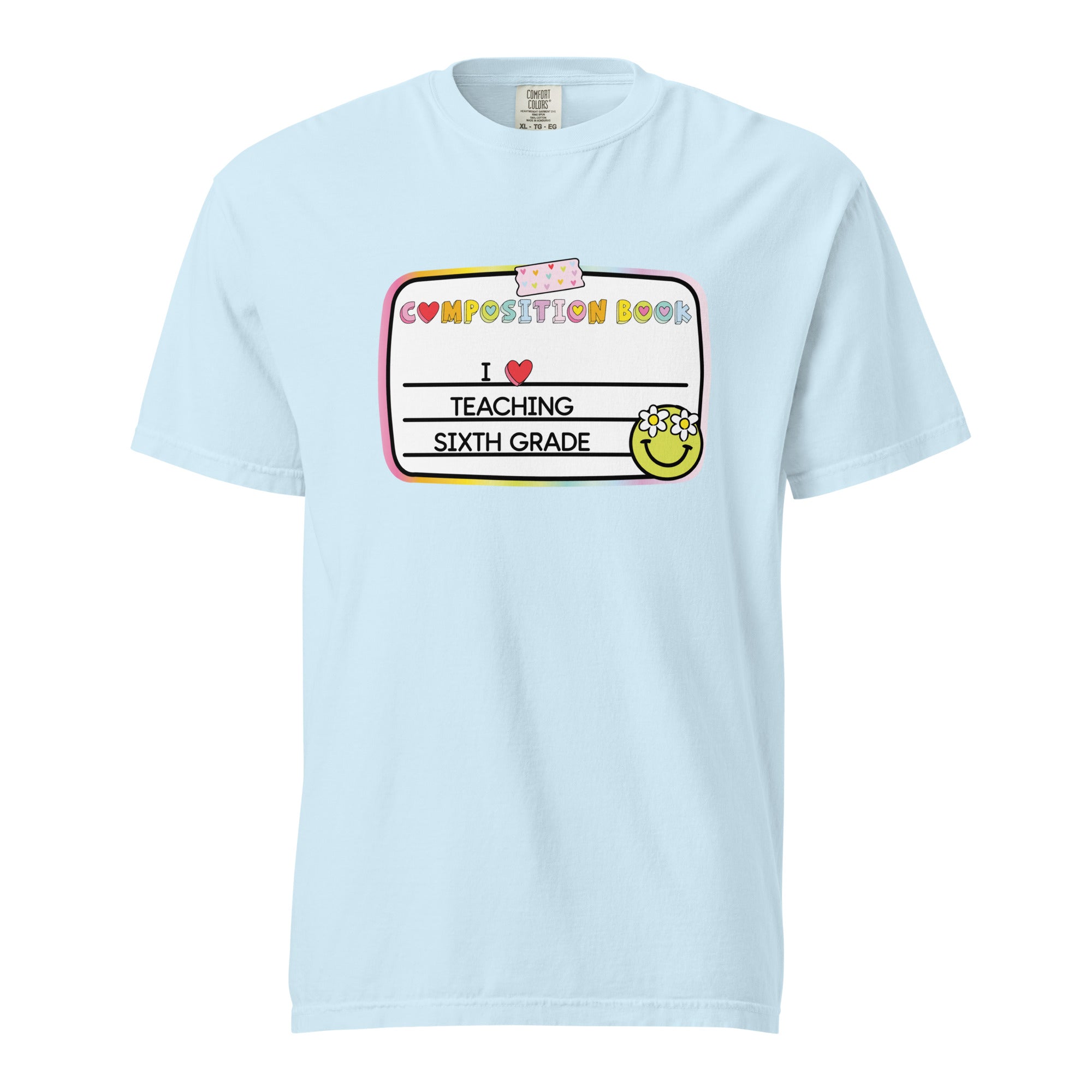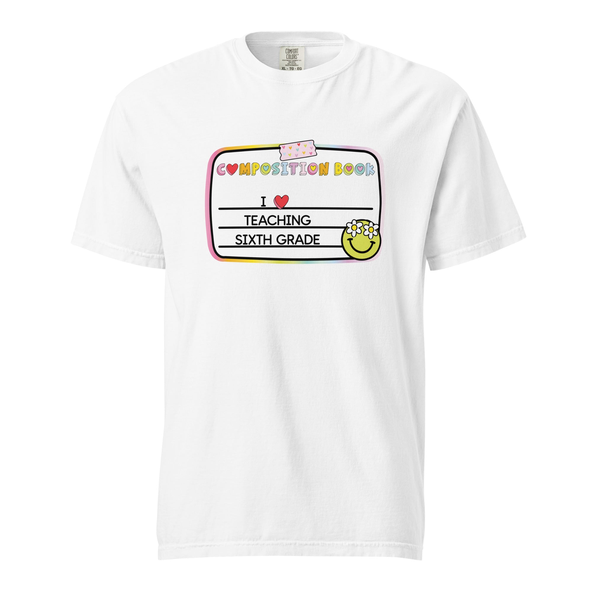Level up your teacher wardrobe with this bold and bright I ❤️ Teaching Sixth Grade tee from the Emotional Roller Coaster collection. It’s packed with retro flair, pastel hearts, and all the middle-grade motivation.