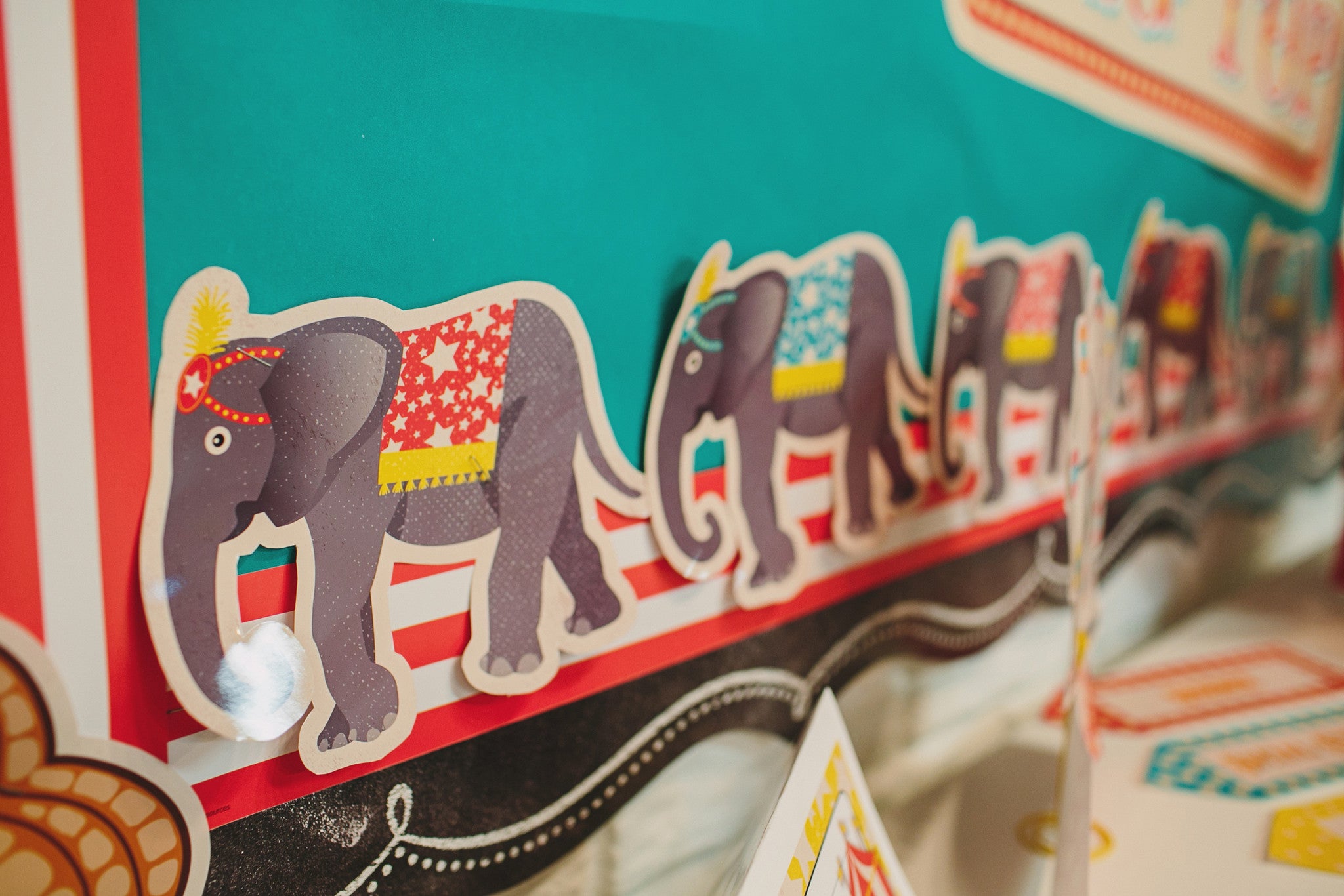 - Large "Vintage Circus" calendar with seasons, days of the week, and bulletin board embellishments (print at your favorite office supply store) *I print each page on 18x24 sheets of plain white paper. Laminate for durability.